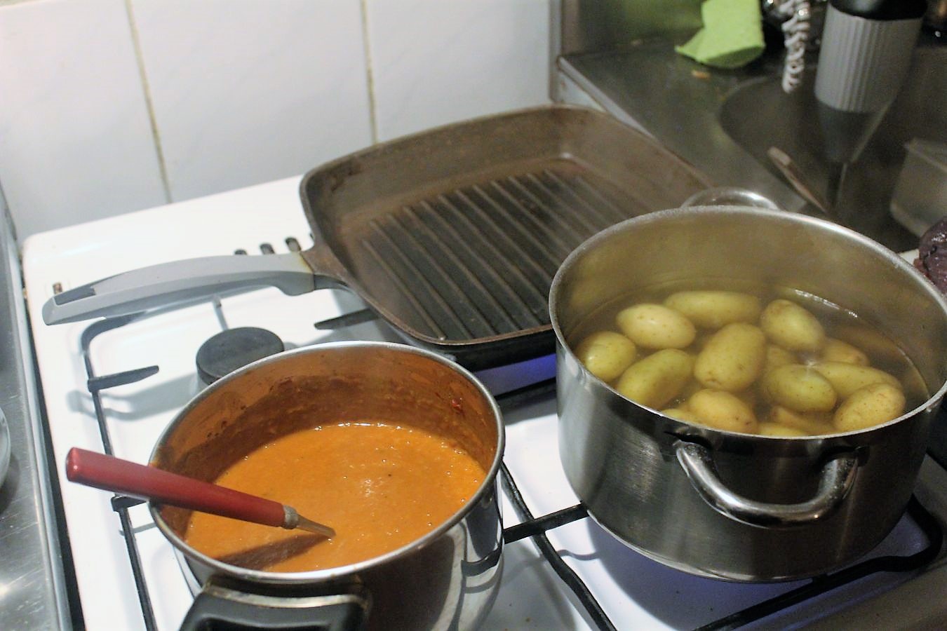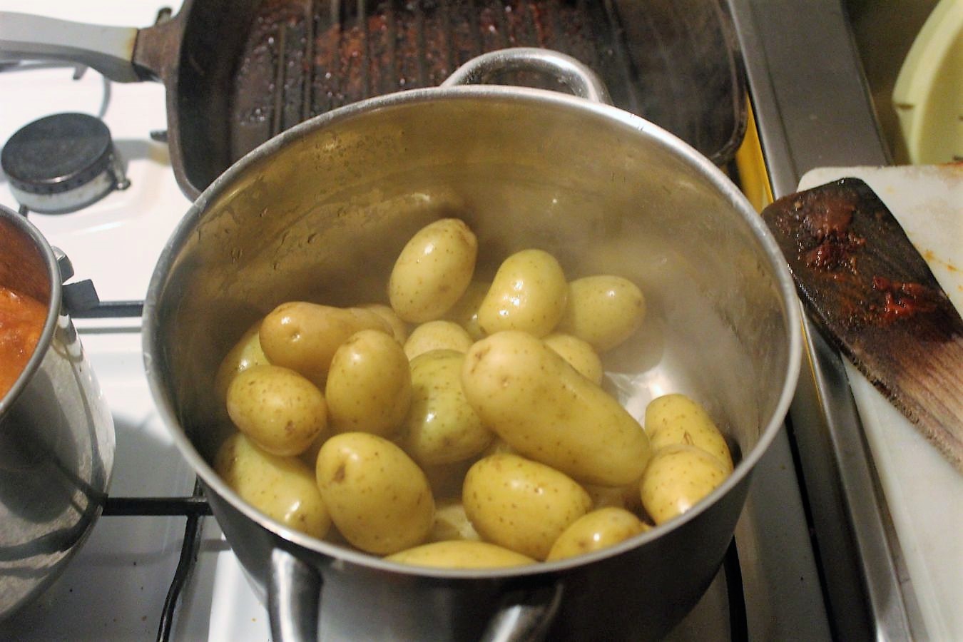 Die Kartoffeln waren ein Sonderangebot beim letzten Gemüseeinkauf. Französische Drillinge, mit dünner Schale für einen Euro, statt € 2,49 pro Kilo. Roastbeef war auch im Angebot, beim Mix Markt für 8,99 ab drei Kilo Abnahmemenge. Der Wein ist irgendein scheußlicher 13 % Blindmacher aus Chile. Ich sage mal € 2,99 bei Metro.
