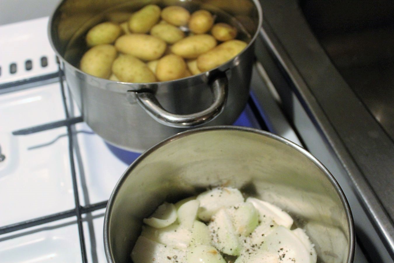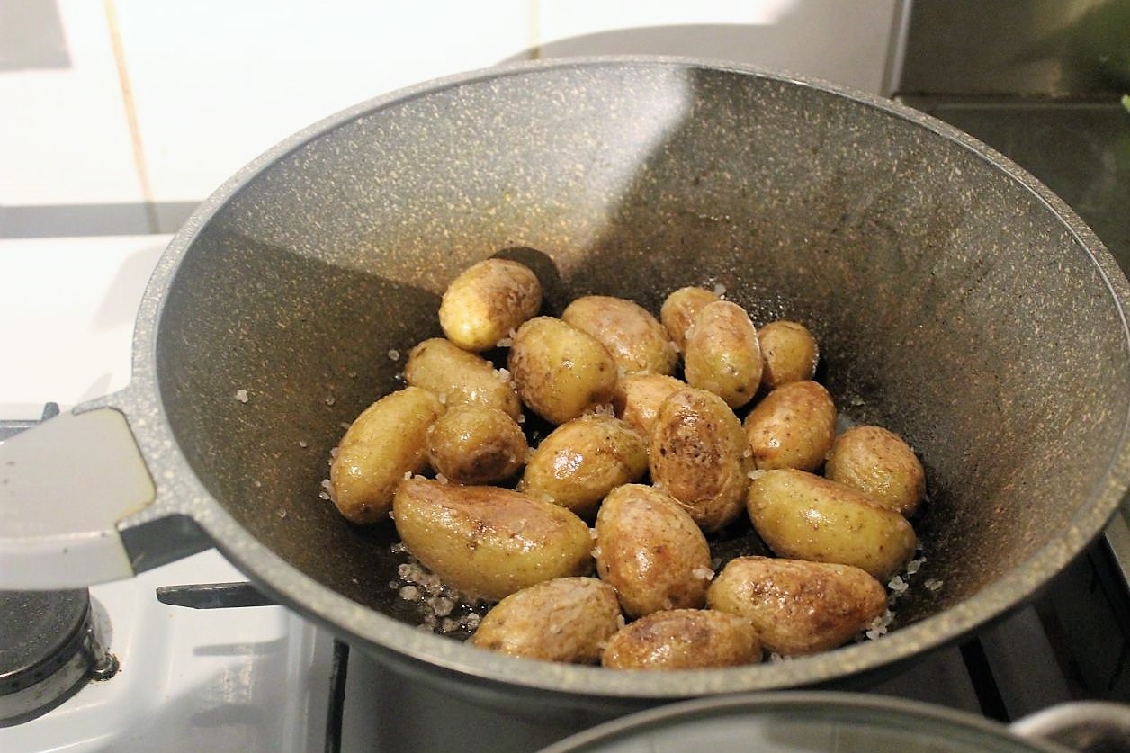 Kartoffeln mit 2 Esslöffeln Meersalz in kaltem Wasser aufsetzen. Wenn das Wasser kocht, noch 18 Minuten kochen lassen.