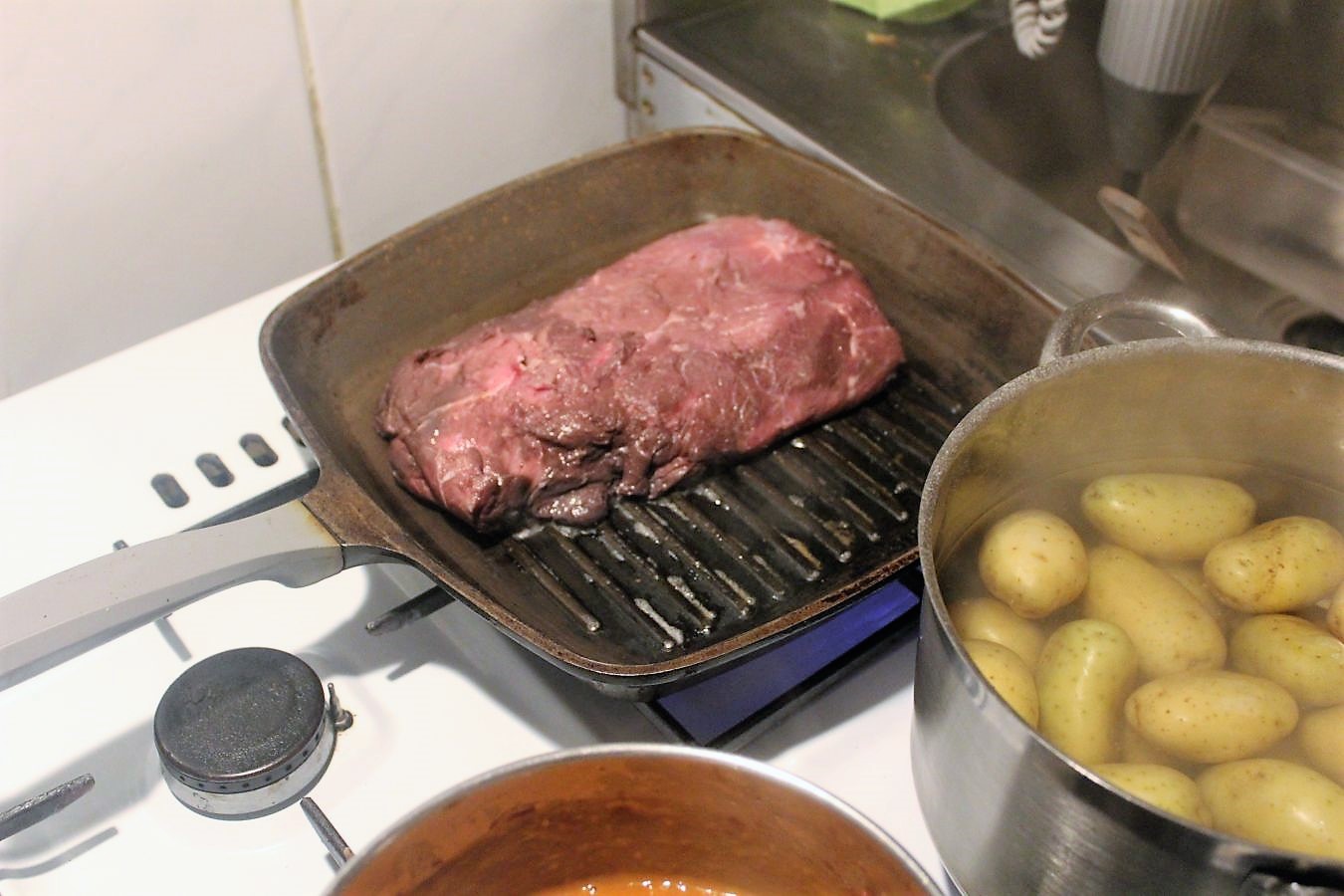 Die Pfanne muss knallheiß sein, wenn das Fleisch rein kommt, dann wird es schön saftig.
