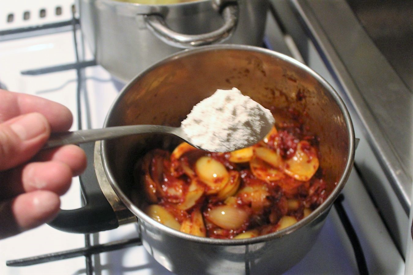 Wenn das Tomatenmark rehbraun ist, einen Esslöffel Mehl in den Topf geben.