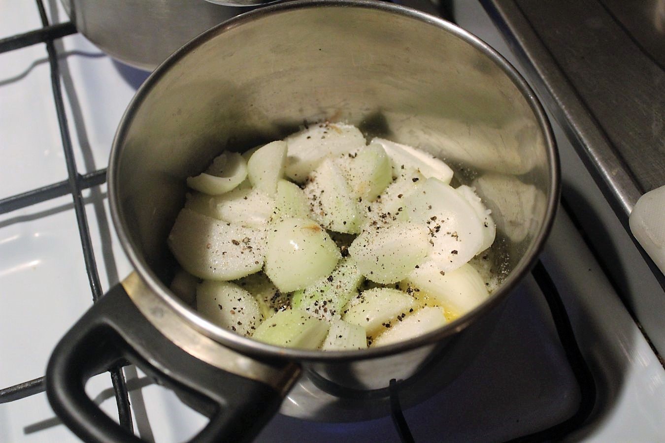 Zwiebeln grob zerkleinern mit Zucker, Salz und Pfeffer volle Pulle anbraten und glasig werden lassen