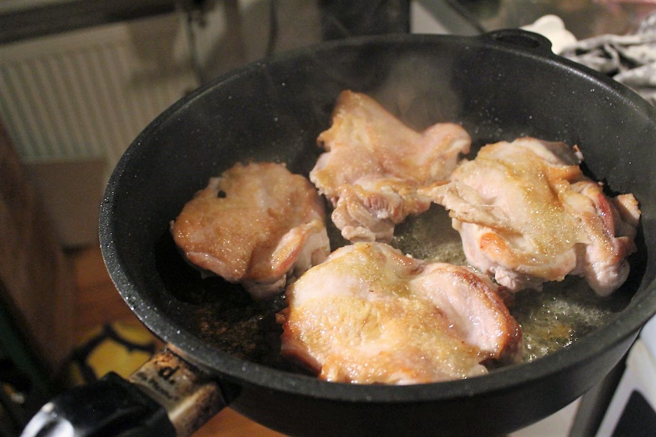 Das Hähnchenfleisch für 5 Minuten bei 80 Grad in den Ofen stellen und dort ruhen lassen, wenn die insgesamt 10 Minuten in der Pfanne rum sind.