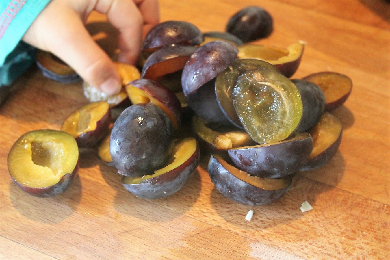 Um dann trotz des Messers, noch einmal gierig nach den zerkleinerten Pflaumen zu greifen.