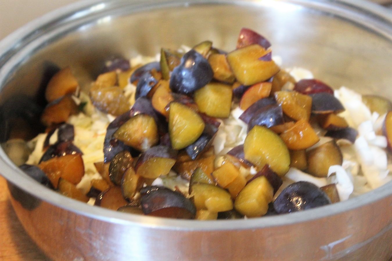 Ich muss meiner Bande zuhause ja immer irgendwas neues vorführen, damit Ihr auch etwas zu sehen bekommt, was ich noch nicht hatte. Das ist oft ein ziemlicher Spagat, weil Kinder vieles nicht mögen, egal wie gut es schmeckt und deswegen arbeite ich dabei mit fiesen Tricks. Weil im Moment alle täglich nach frischem Pflaumenkuchen fragen, den ich deswegen mindestens zwei Mal die Woche backen muss, gibt es hier jetzt meinen Spitzkohlsalat mit Pflaumen.