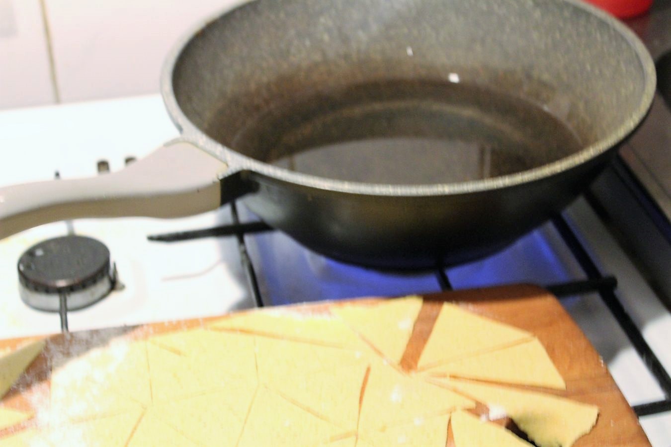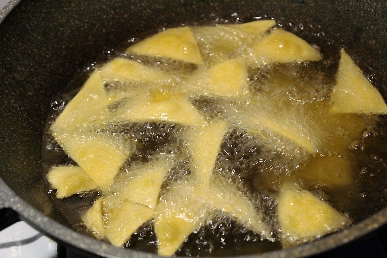 Man kann die Nachos mit dem Teig auf Backpapier im Backofen backen, aber mein Gasofen hat keine Oberhitze und das war mir mitten in der Nacht echt zu doof, die nach 5 Minuten auch noch umzudrehen und mir die Finger zu verbrennen. Nachos aus dem Ofen sind Mädchenkram. Wenn schon, denn schon!
