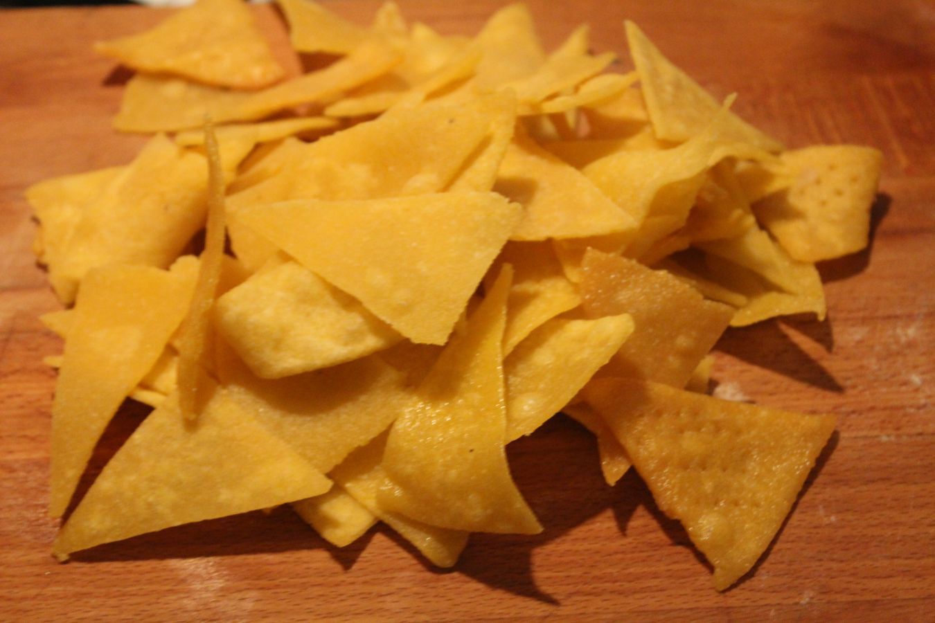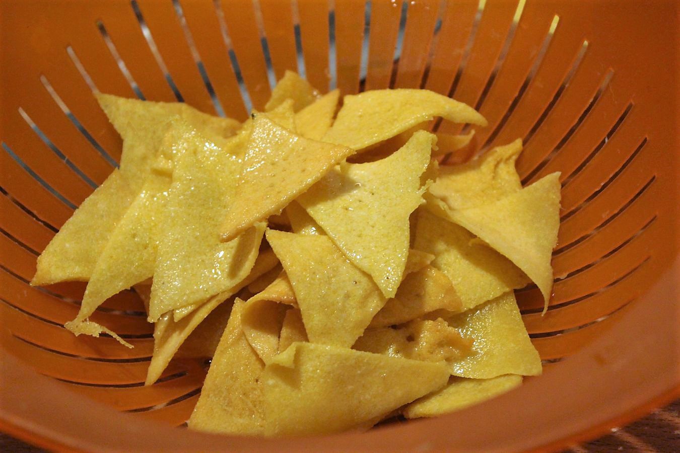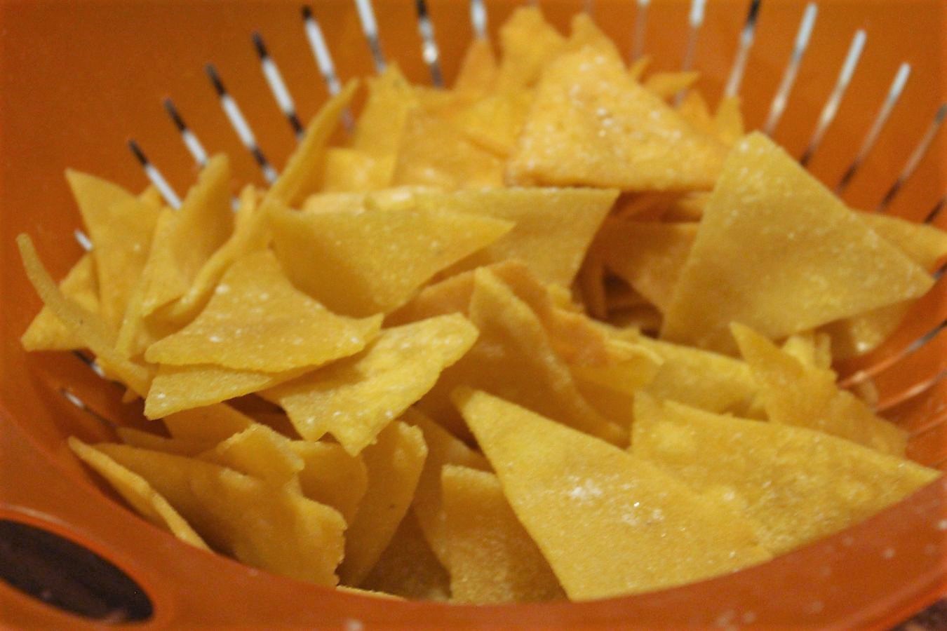 Die Nachos kommen relativ weich aus dem Fett und werden erst beim Trocknen und erkalten knusprig und hart, also nicht in Panik verfallen, wenn die Frisch aus dem Fett noch nicht den crunch haben.