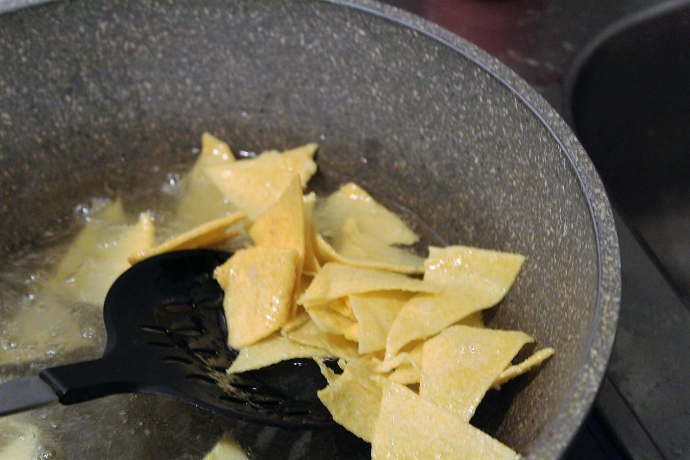 Dann die Nachos mit dem Schaumlöffel rausholen und in ein Nudelsieb zum Abtropfen legen.