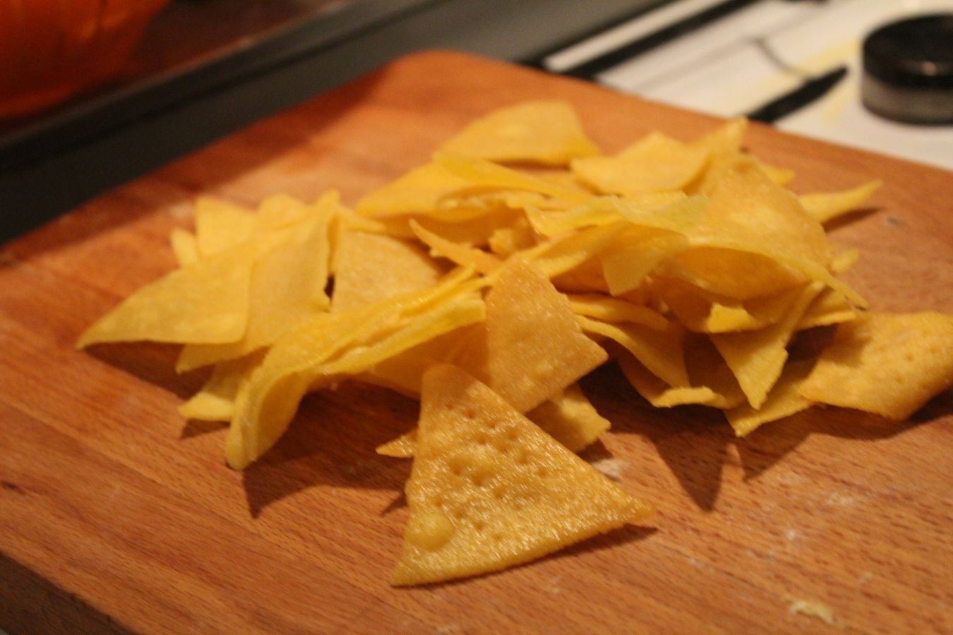 Wie geil, eigene Nachos zu mexikanischen Gerichten wie Chili, mit Guacamole, feuriger und/oder Käsesoße, oder zum Bier, oder zum Knabbern vor dem Fernseher, für die Brut in die Brotbox in der Schule und immer schneller Nachschub, wenn die mal spontan gebraucht werden. Das sind die Tage an denen man sich so fühl, als wenn man das Feuer erfunden hätte.