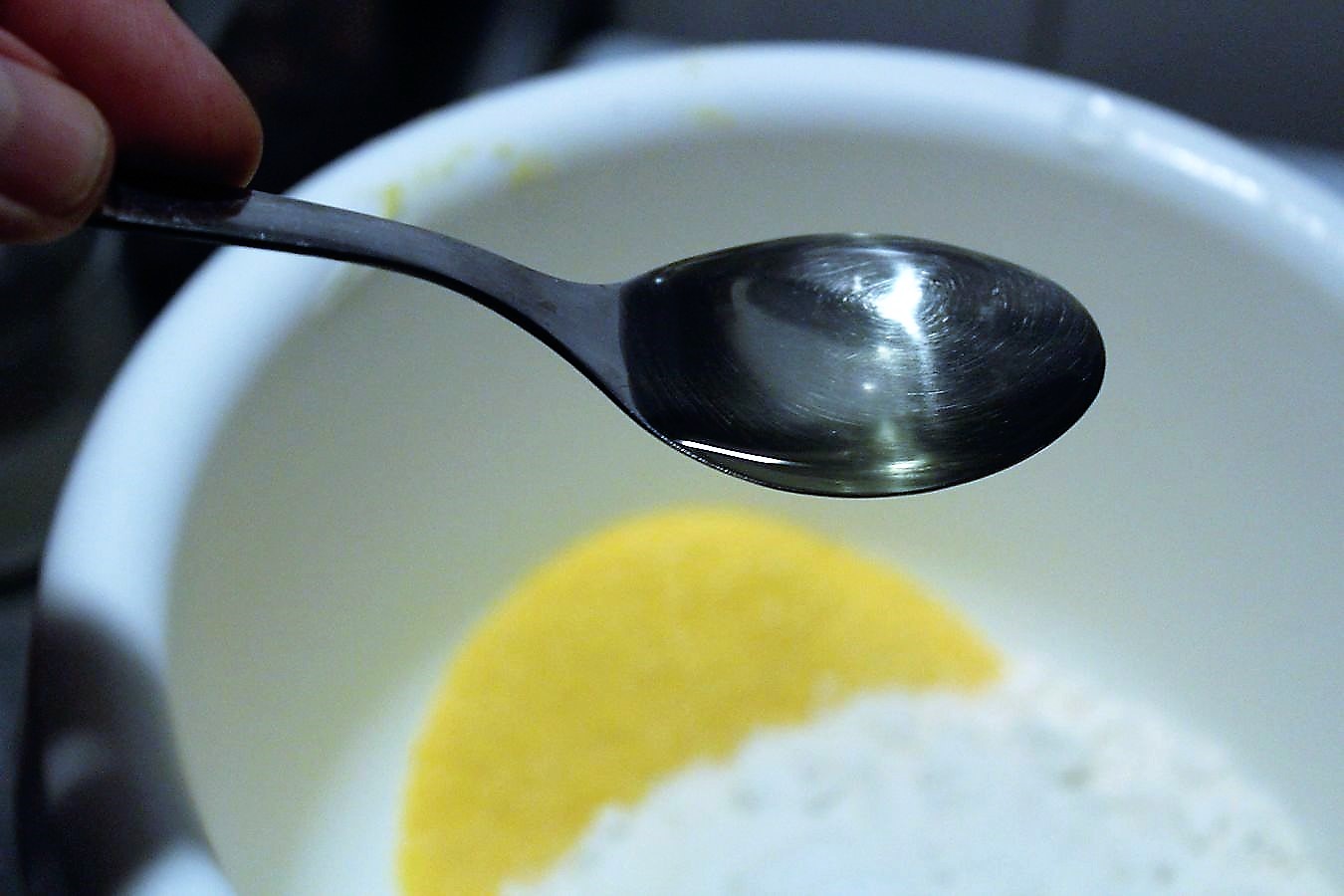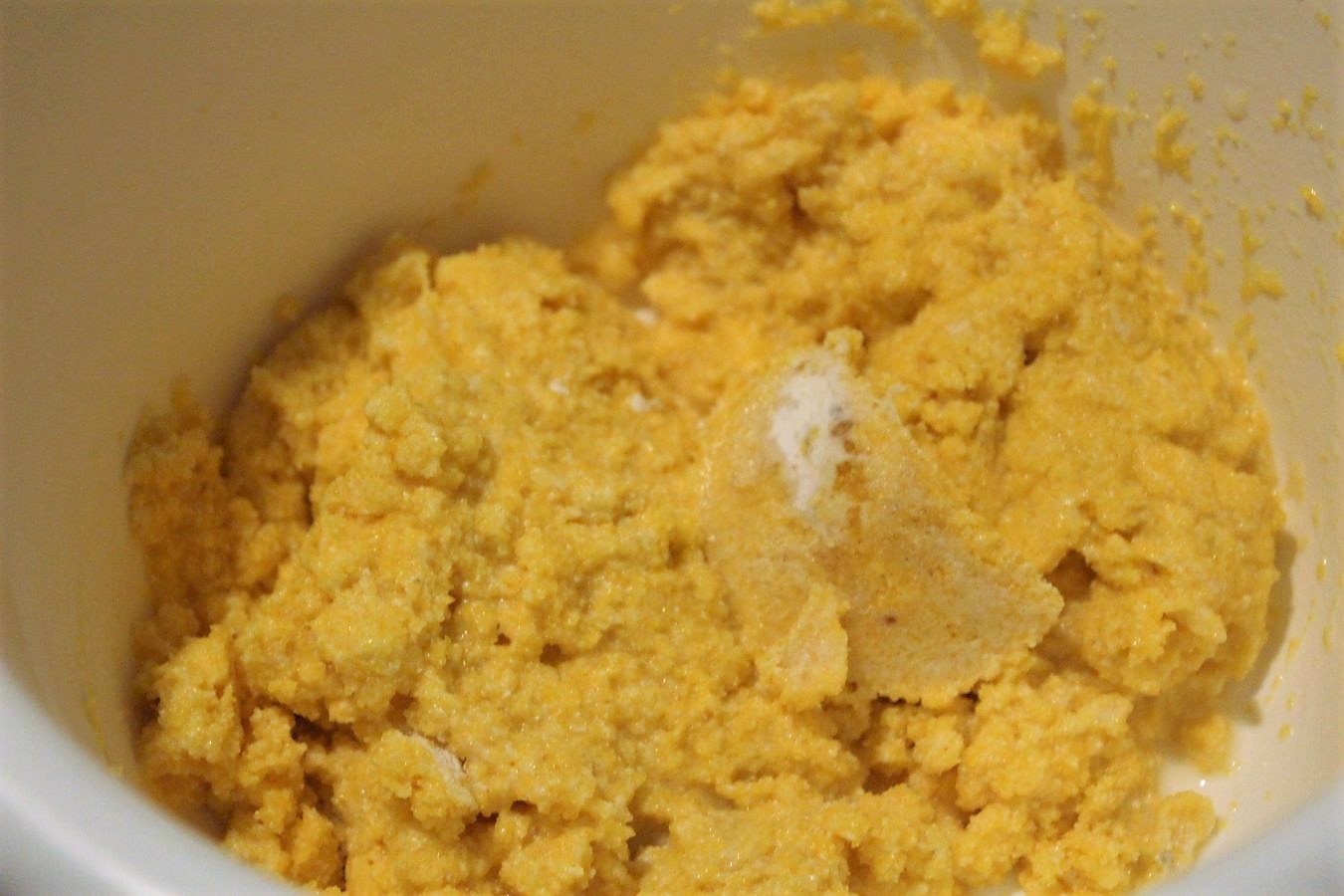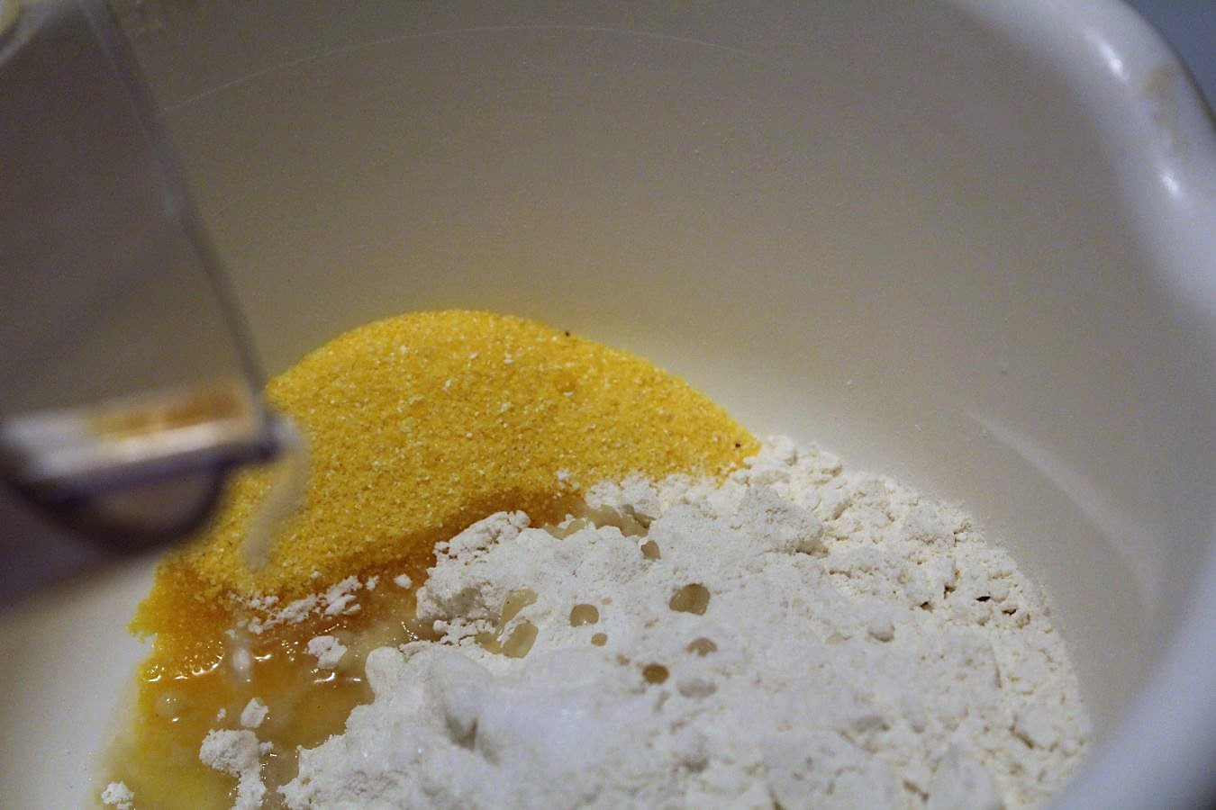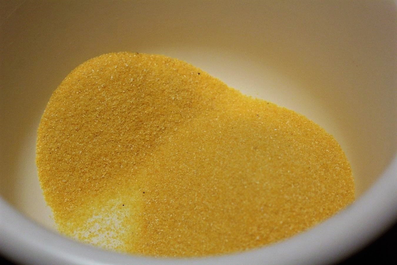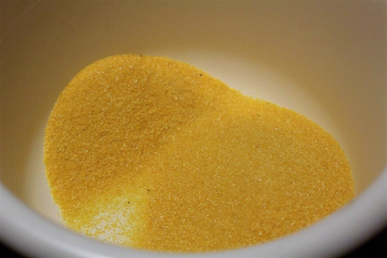 200 Gramm Maisgrieß / Polentagrieß abwiegen. Es geht auch Maismehl, da ist dann nur die Oberflächenstruktur anders.