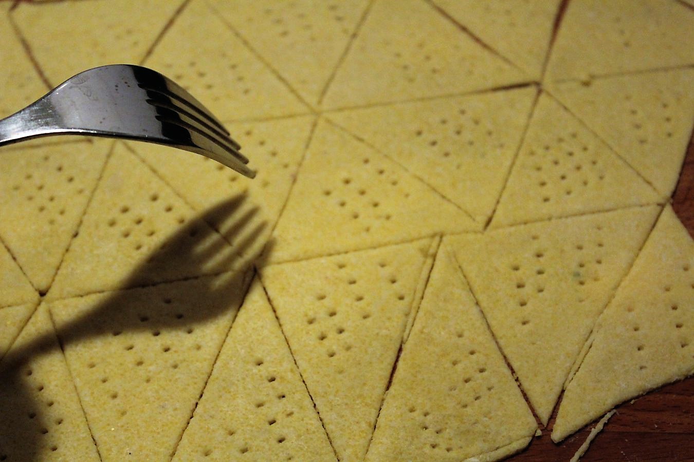 Deswegen mache ich mit der Gabel ein pittoreskes Muster in die Nachos, zumindest bei der ersten Ladung, um zu sehen was es für einen Unterschied macht, wenn man die Nachos vor dem Backen nicht perforiert.