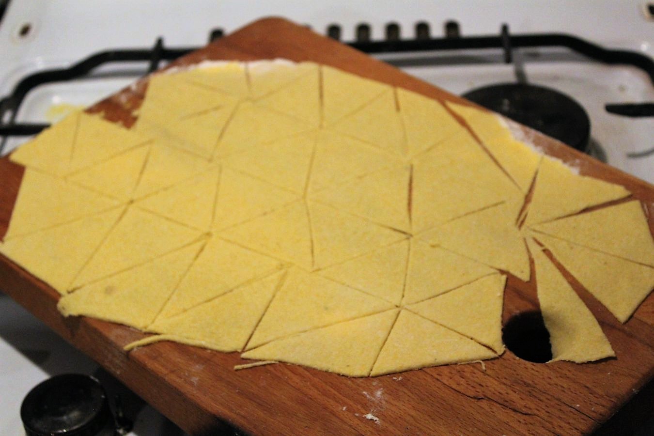 Alles keine Hexerei. Achtet darauf, dass ihr genug Mehl unter dem Teig habt, damit sich die Nachos wieder gut vom Brett lösen, ansonsten ein scharfes Messer zum Anheben der rohen Teigdreiecke.