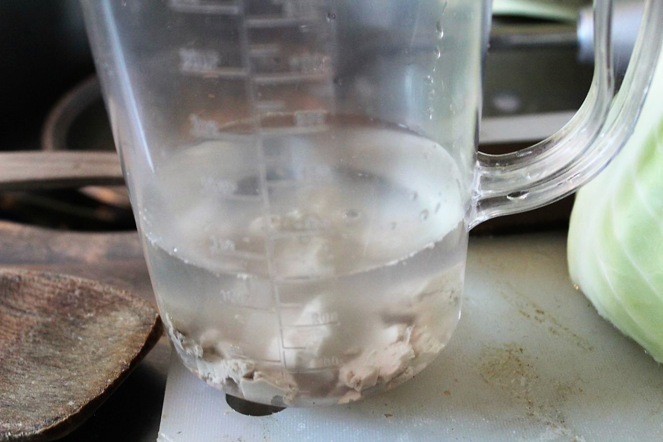 1/2 Würfel Hefe in 250 Milliliter Wasser auflösen, ein Prise Zucker dazu geben.