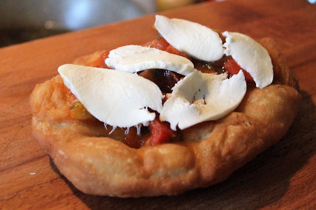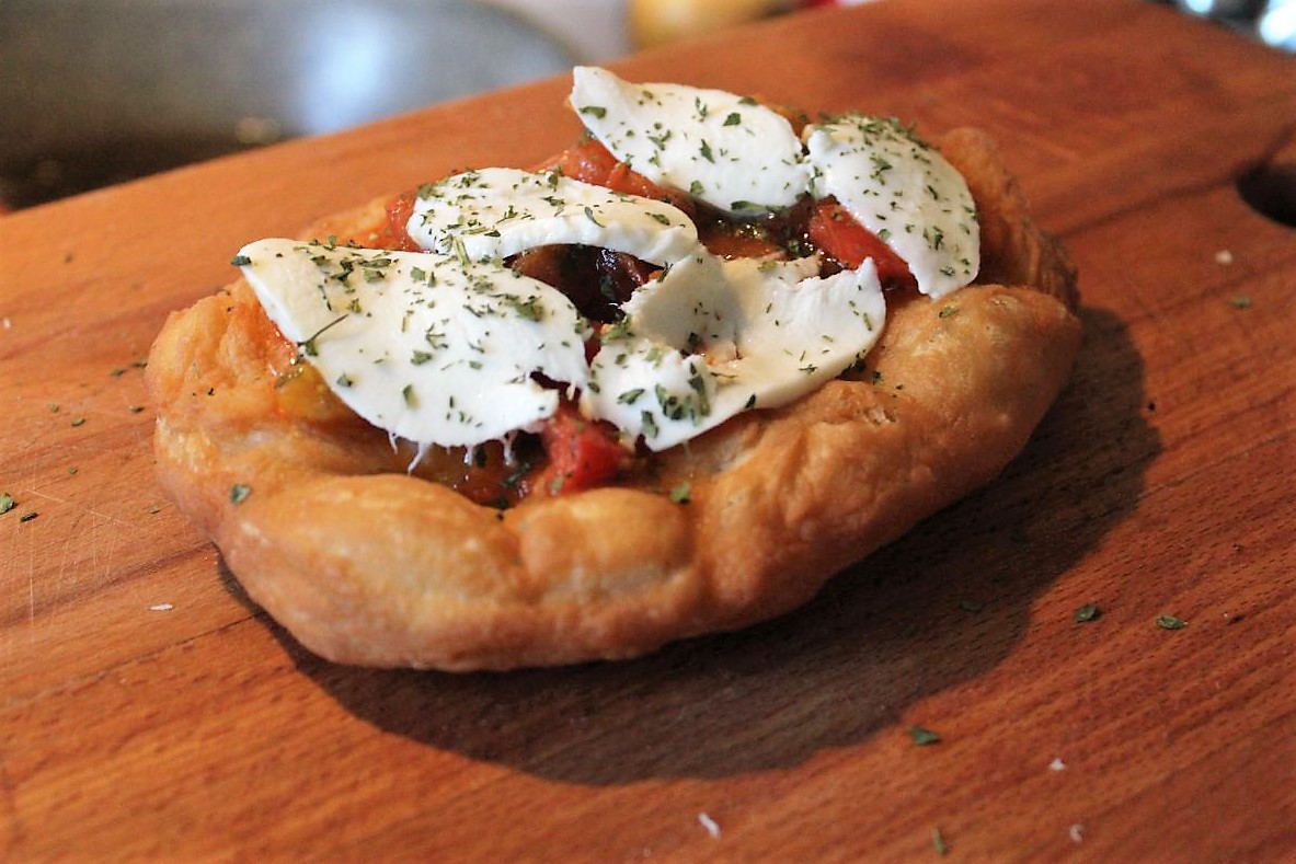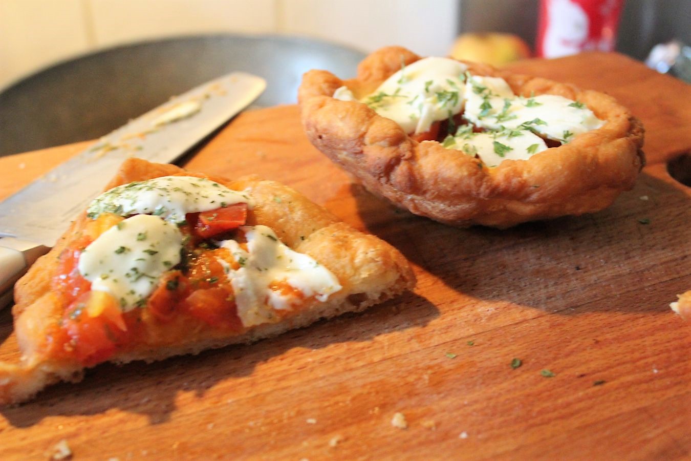 Sehr geil! Schmeckt so richtig heiß, ölig und fettig. Lecker mit den Tomaten und dem Mozzarella, knuspriger Teig. Der Teig ist nicht voll Öl gesogen, sondern man kann gut erkennen, dass nur die Oberfläche im Öl war. Darunter geht der Teig schon auf und fühlt sich an, wie gebacken. Wenn man keinen Ofen hat, oder wenn man mal etwas anderes servieren möchte, dann ist das ganz weit vorne. Meine Frau sagt, dass das ganz groß wäre, sie aber weiterhin Ofenpizza bevorzugen würde. Die läuft aber auch in einer anderen Liga und wir gehen jetzt ja gerade davon aus, dass man keinen Ofen zur Verfügung hat, z.B. Studentenbude, Camping, Wohnung mit mieser Ausstattung