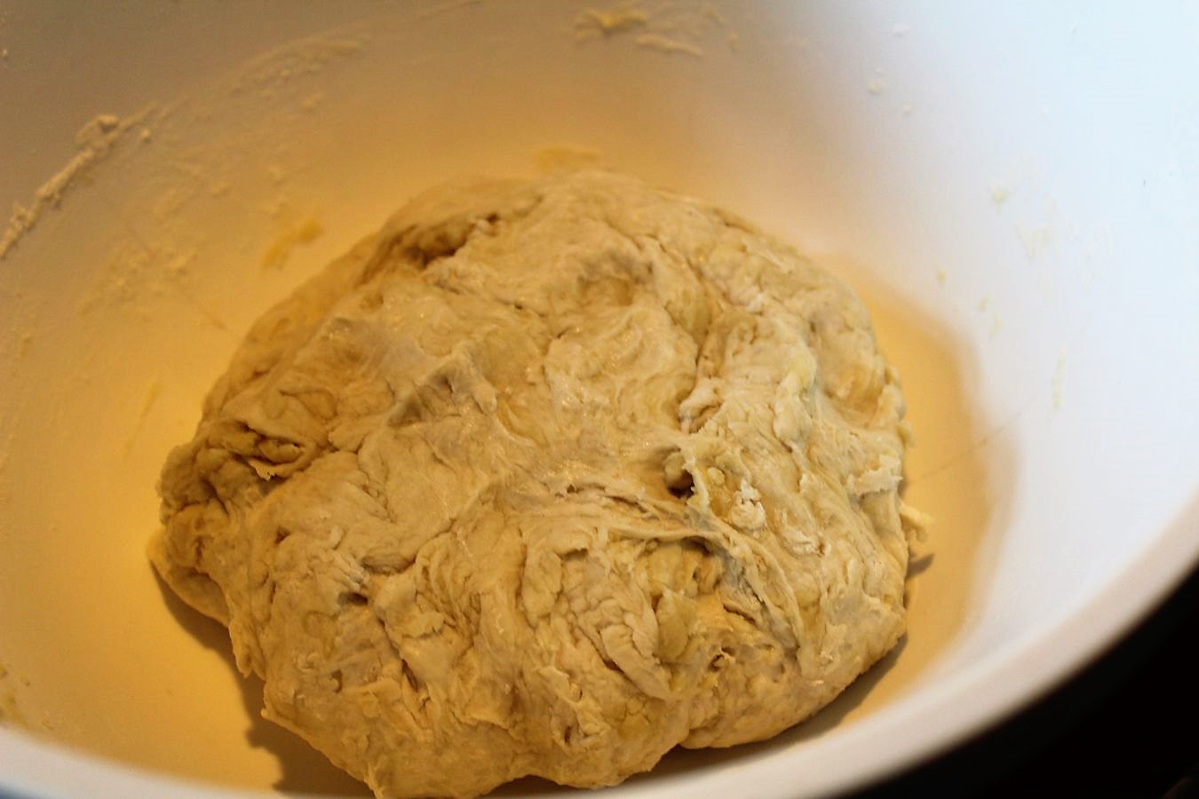 Wasser zu den anderen Zutaten in die Schüssel gießen und mit dem Löffel verrühren. Den Rest mit der Hand kneten. Keine Sorge der Teig klebt nicht wirklich, ansonsten noch ein bisschen Mehl dazu stäuben.