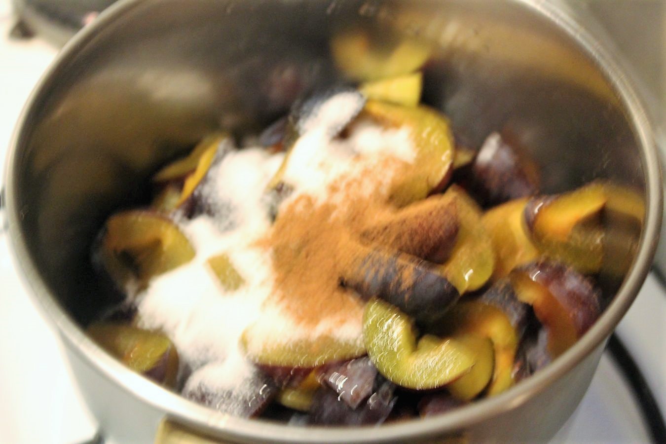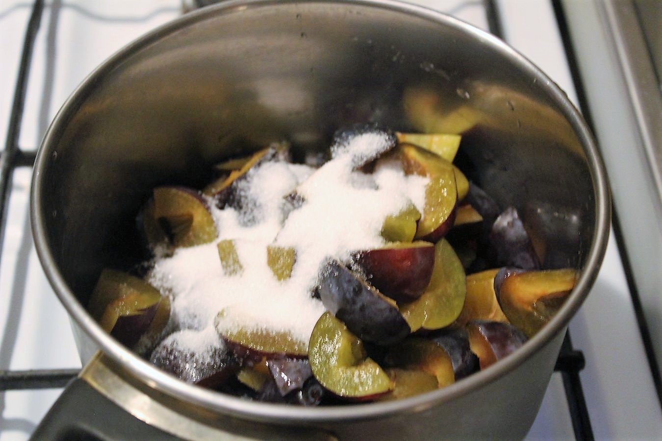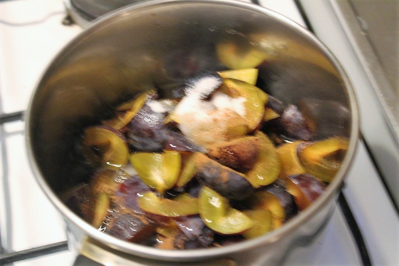 Jetzt kochen wir noch schnell das Kompott. Dazu gibt es bei den Landfrauen keine weiteren Angaben. Das macht auch Sinn, weil man im Juni höchstwahrscheinlich Erdbeeren, im Juli Aprikosen und im Herbst Pflaumen, oder Birnen nehmen würde. Bei mir ist gerade Oktober, deswegen verwende ich ein Kilo Zwetschgen. In Berlin heißt das alles Pflaume, deswegen werde ich das in Folge auch nur noch Pflaume nennen, weil dit einfacha is, wa?