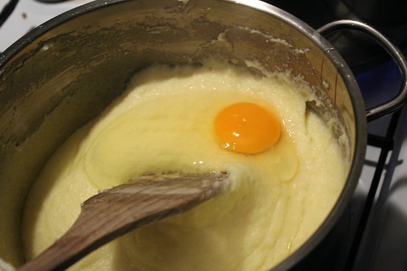 So lange rühren, bis der Grieß richtig fest ist und sich vom Topfrand löst. Auf niedrige Temperatur gehen.