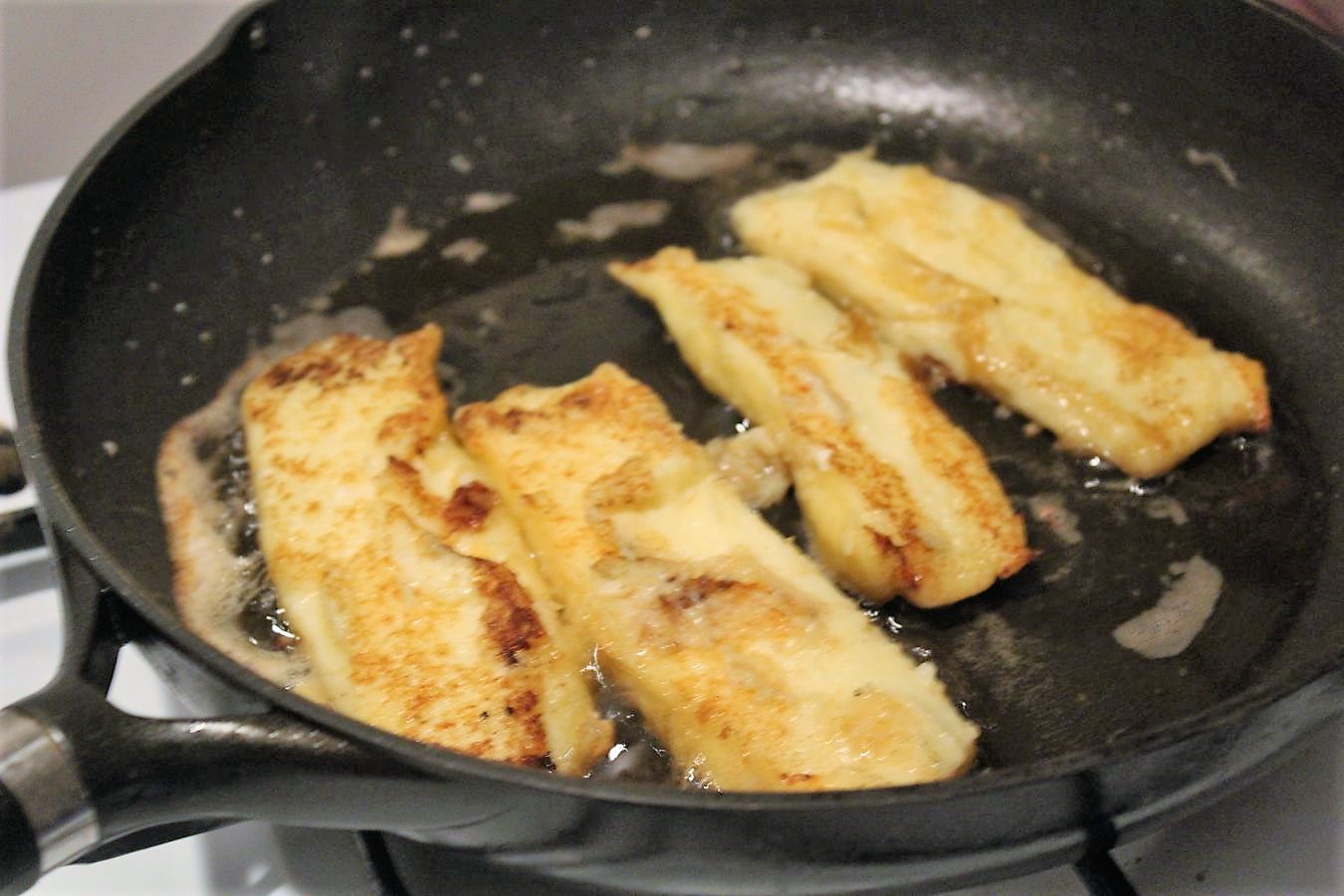 Auf mittlere Hitze gehen und braun werden lassen. Nicht zu heiß werden, damit es außen nicht schwarz wird und drinnen noch kalt ist. Dicke der Grießschnitten circa 1 Zentimeter.