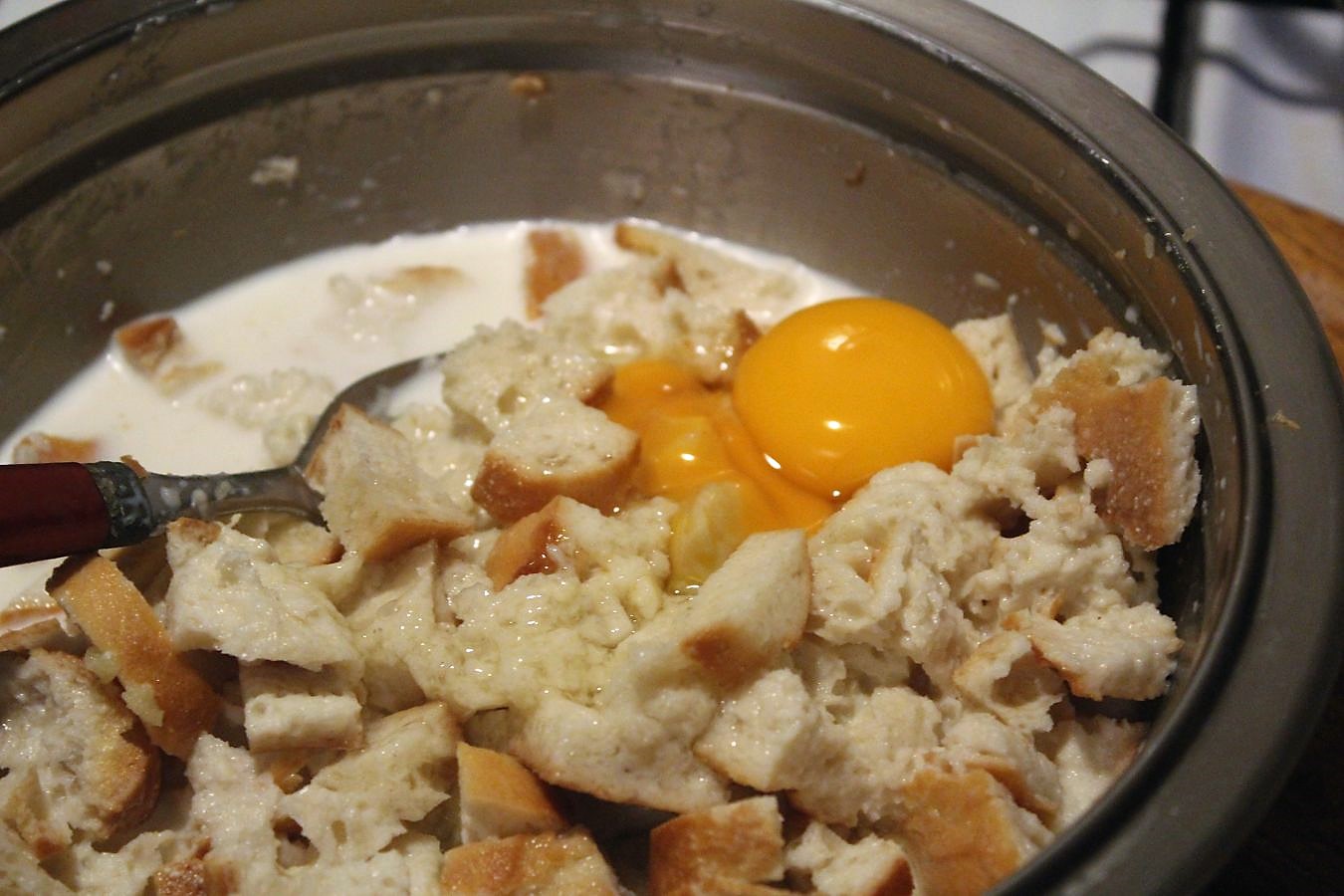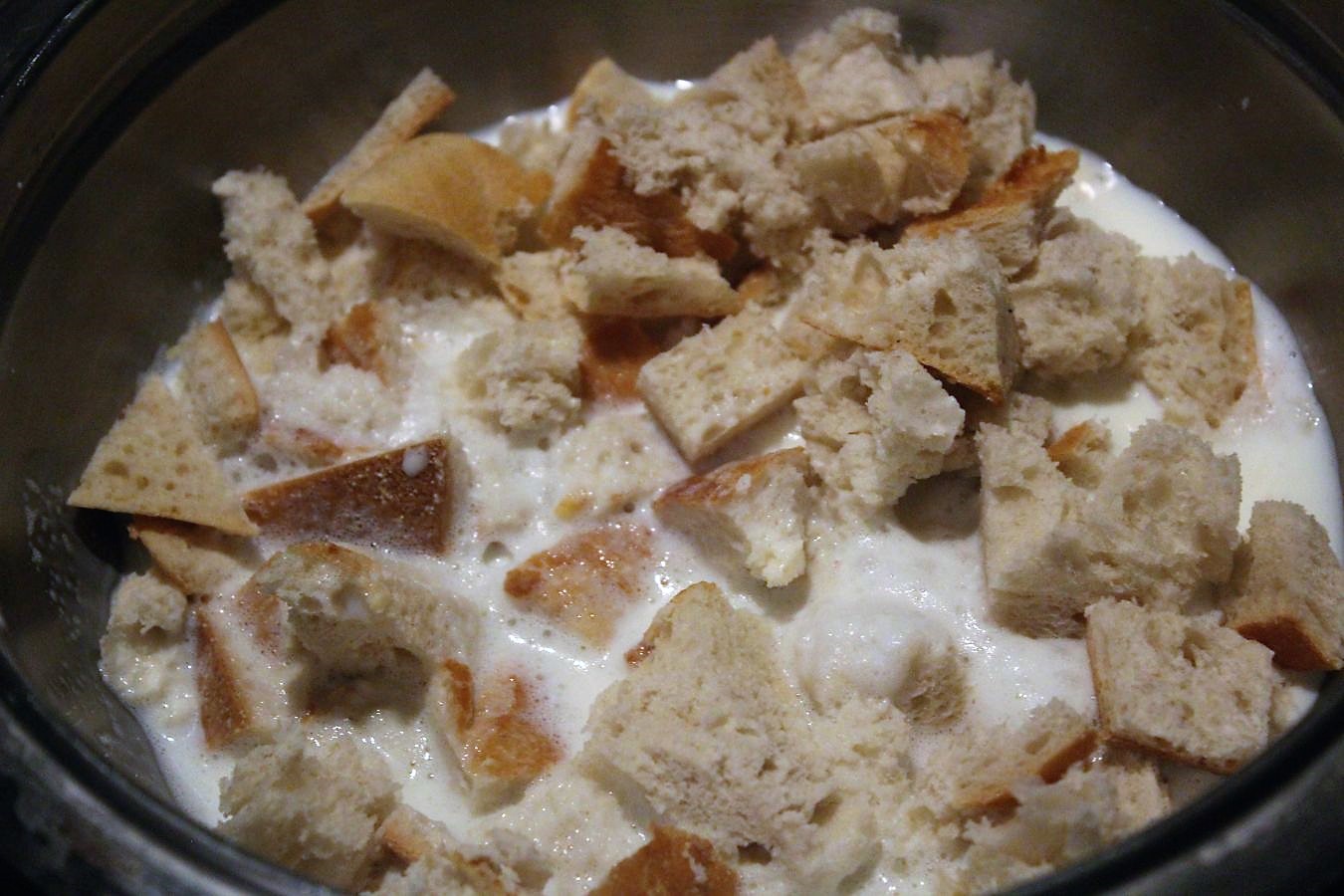 0,2 Liter Milch in die Schüssel geben und das Brot damit vollsaugen lassen. Verdiente Werktätige haben mich aber sofort nach Veröffentlichung des Rezepts darauf hingewiesen, dass sie Wasser verwenden und keine Milch. Alles kann, nichts muss.