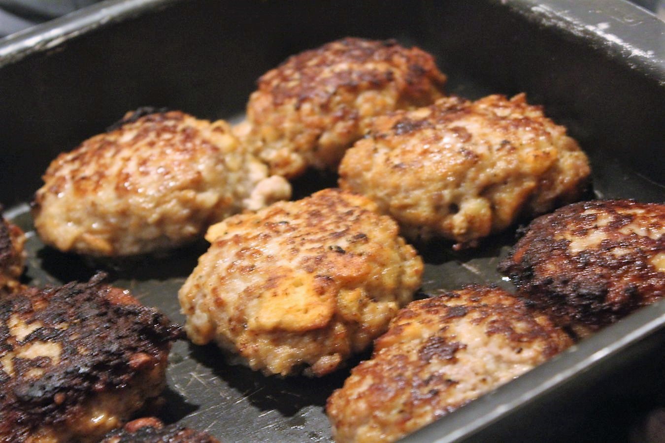 Wenn ich nur 500 Gramm Fleisch als Ausgangsmenge hätte, würde eine Pfannenladung reichen, aber so, muss ich das in zwei Ladungen erledigen. Deswegen stelle ich den Ofen schon mal auf kleinster Stufe an, damit die Buletten aus der Pfanne, noch im Ofen nachgaren können, während die zweite Ladung auf dem Herd steht.