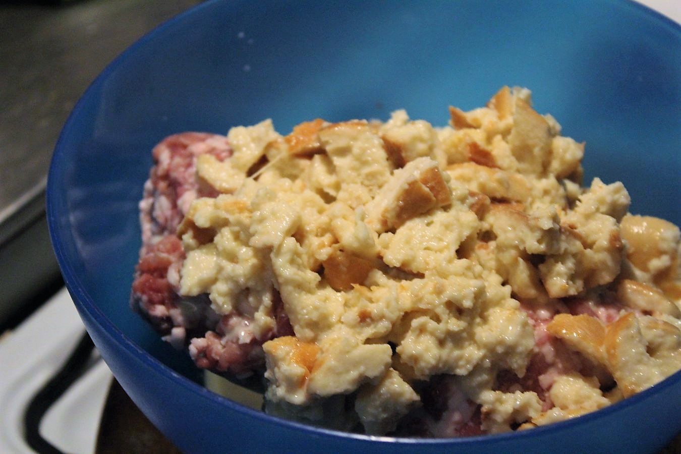 Eine Bulette (oder Frikadelle, wie wir hier im Westen sagen) ohne eingeweichtes Brot ist für mich undenkbar. Semmelbrösel, insbesondere die aus der Pappschachtel, haben da drin nichts zu suchen. Milch ist zum Einweichen optimal, aber wenn ich schon Quark im Teig habe, geht auch Wasser.