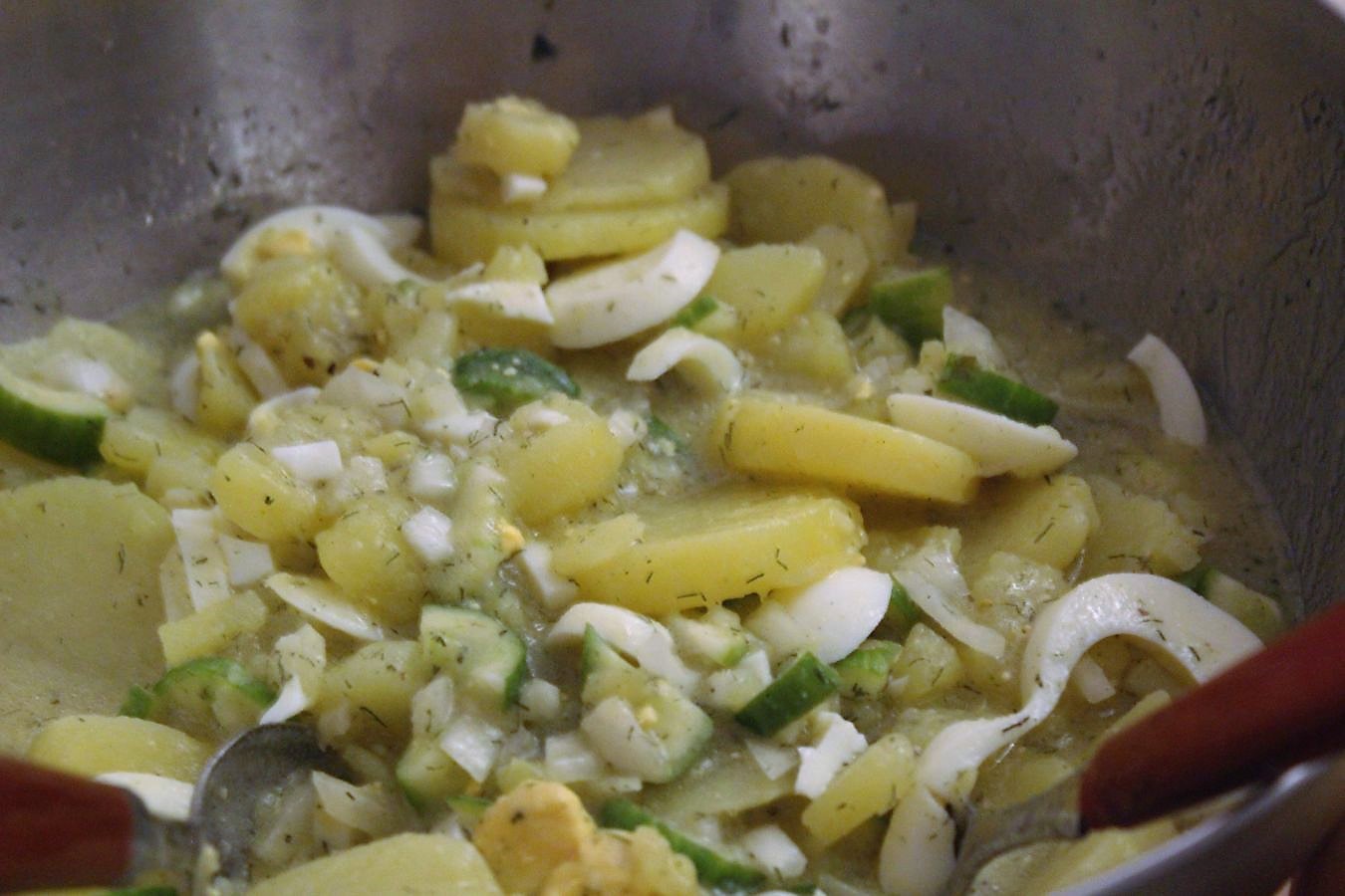 Als Beilage gibt es einen Kartoffelsalat mit Gurken, Eiern und Brühe
