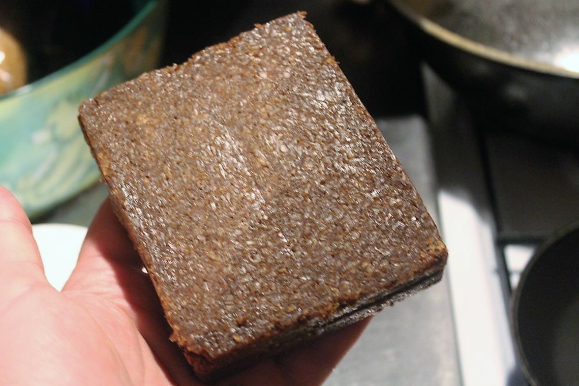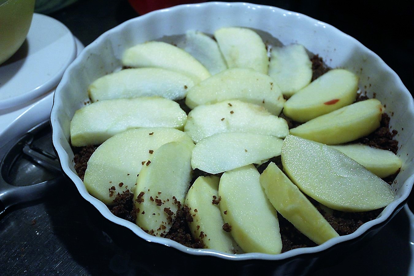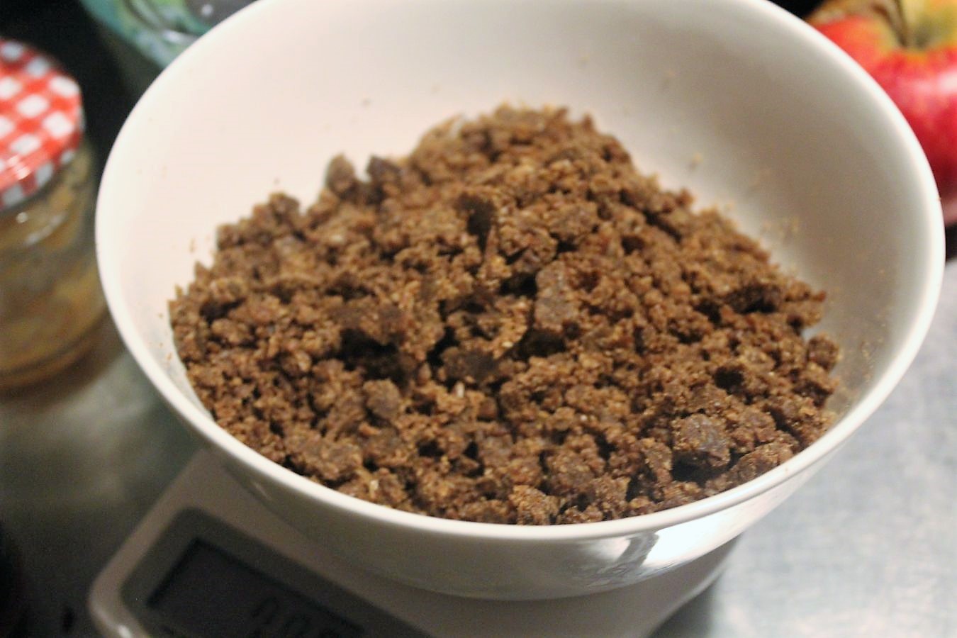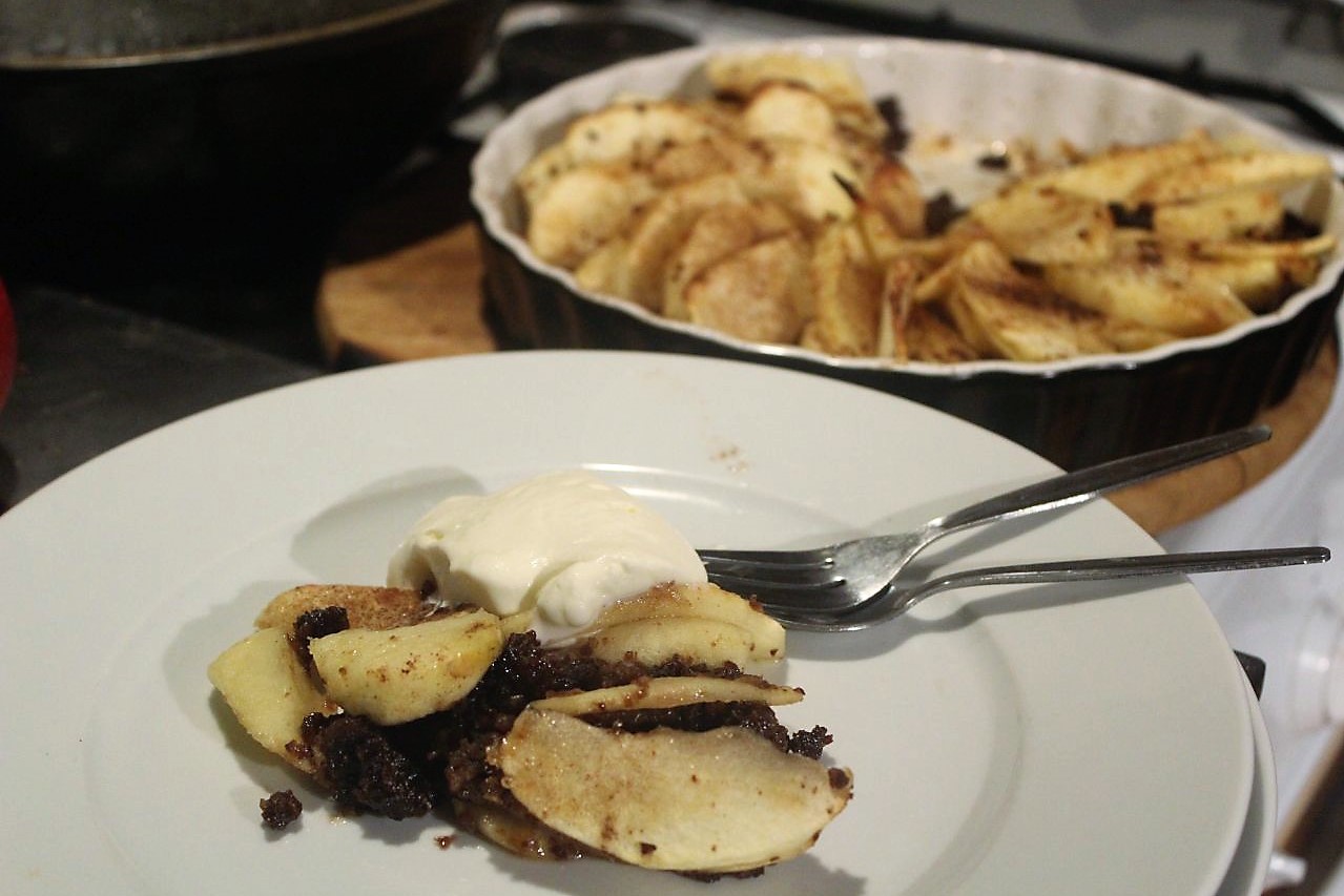 Jetzt kommt der abgefahrene Teil des Rezepts, Pumpernickel! Das ist bekanntlich ein ganz derbes Schwarzbrot, das man eigentlich nur für ganz derbe deftiges Zutaten nimmt. Lachs, Schinken, Käse und so. Ich war echt gespannt, ob das zusammen mit Äpfeln und Zucker funktioniert, aber da ich aus dem Kochbuch bisher nur Volltreffer hatte, habe ich mich darauf eingelassen.