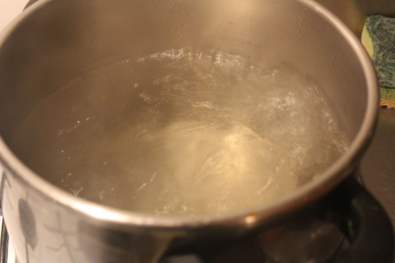 Während das Wasser heiß wird, kann man schon die beiden Knoblauchzehen abziehen und zerkleinern.