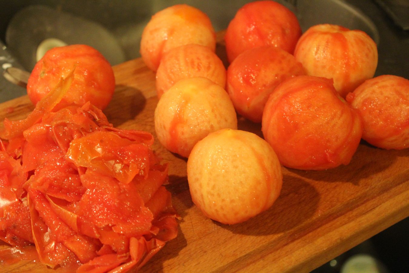 Wenn das Wasser gekocht hat, den Herd abstellen und die Tomaten reinlegen. Je nach Dicke der Schale, kann es eine Minute dauern, sollte aber nicht länger als zwei Minuten dauern, bis man die Haut der Tomate abziehen kann.