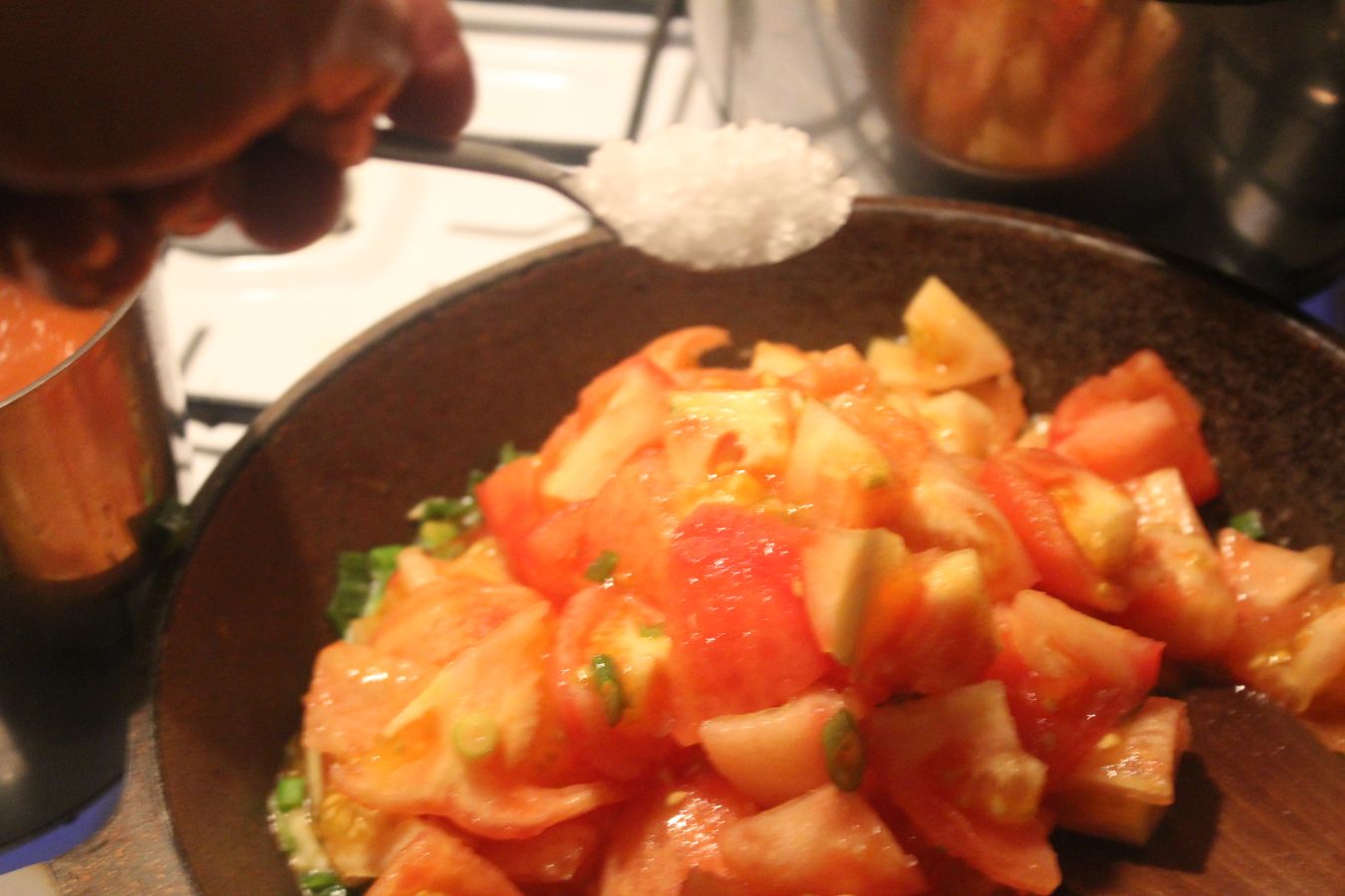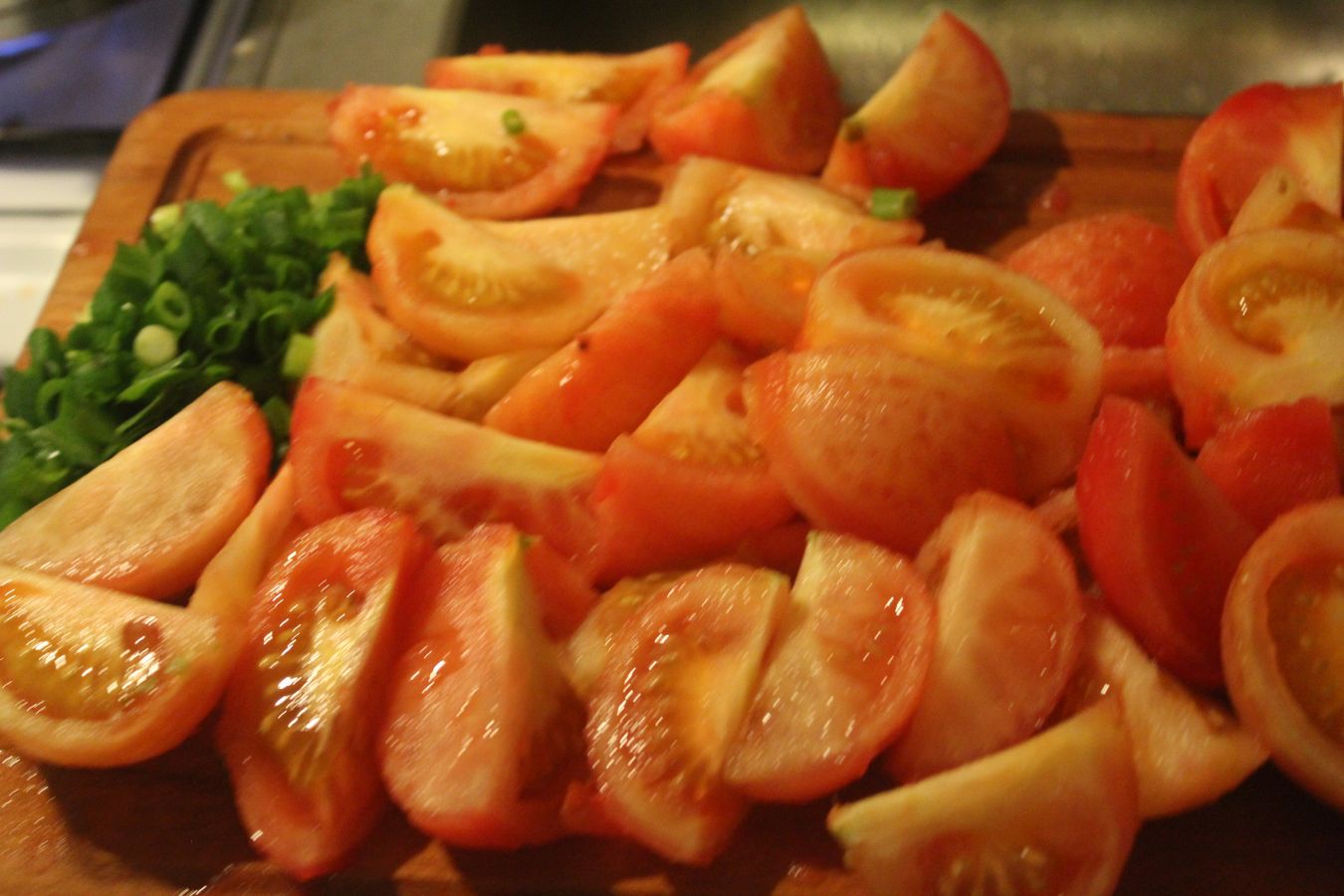 Die Tomaten schmecken damit jedenfalls ganzjährig wie frisch aus dem Garten, o.k. einigen wir uns darauf, dass sie nicht wie aus dem Gewächshaus schmecken und eine feine Säure haben und richtig Geschmack nach Salz und Pfeffer. Das kann ja nicht jede Tomate von sich behaupten. Knoblauch und Lauchzwiebeln leisten dazu auch Ihren Beitrag. Sehr geil!