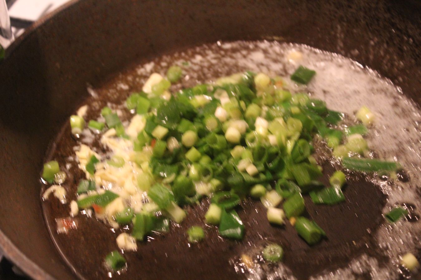 Die Lauchzwiebel ebenfalls für eine Minute in die Pfanne geben