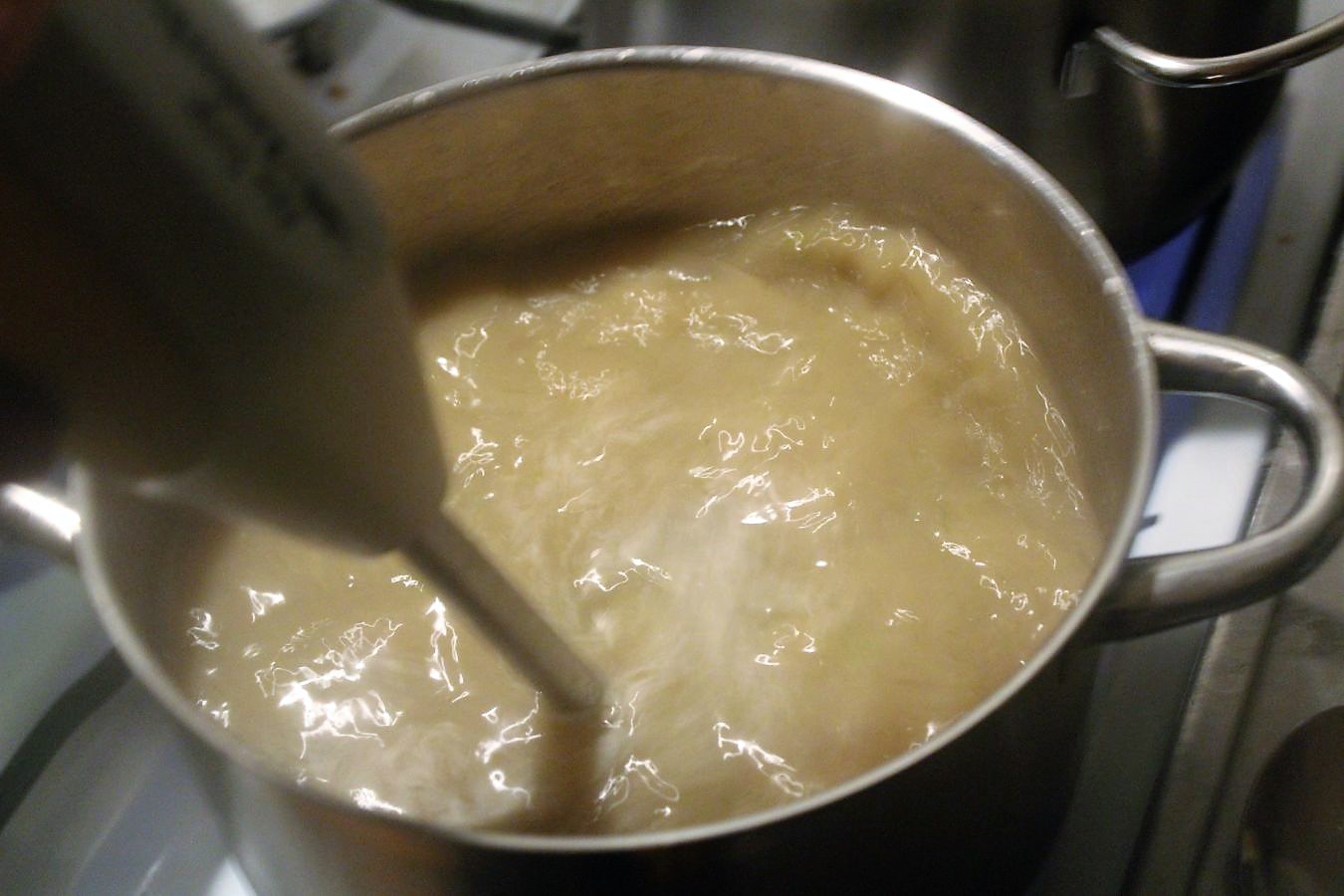 Wenn die Brühe heiß ist, die Kartoffeln in den Topf werfen. Wenn man sie vorher noch ein wenig zerkleinert, dann lassen sie sich hinterher noch besser pürieren.