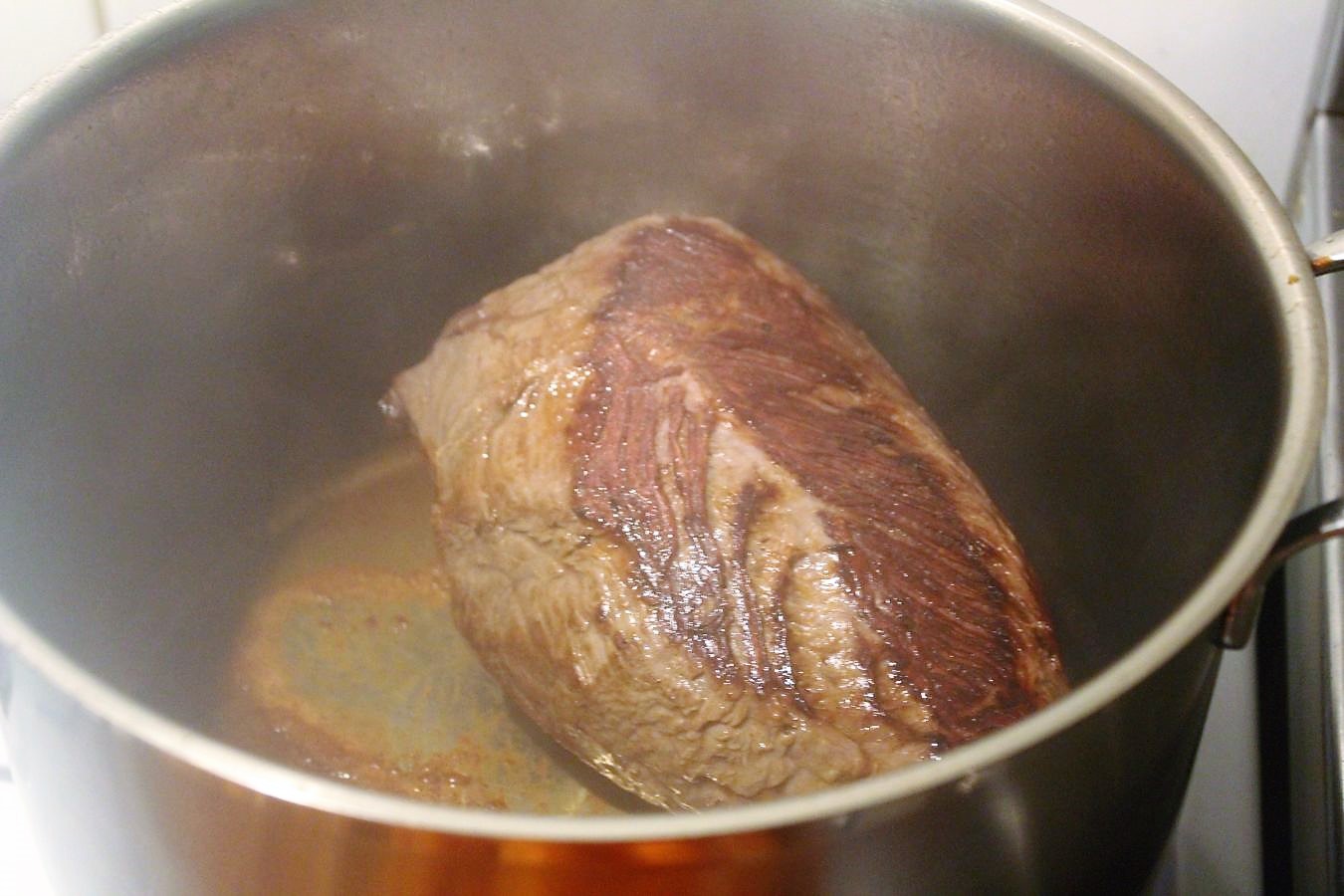 Deckel auf den Topf legen, Topf auf die kleinste Platte umziehen und auf kleinster Flamme 3 Stunden schmoren lassen. Jede Stunde das Fleisch umdrehen.