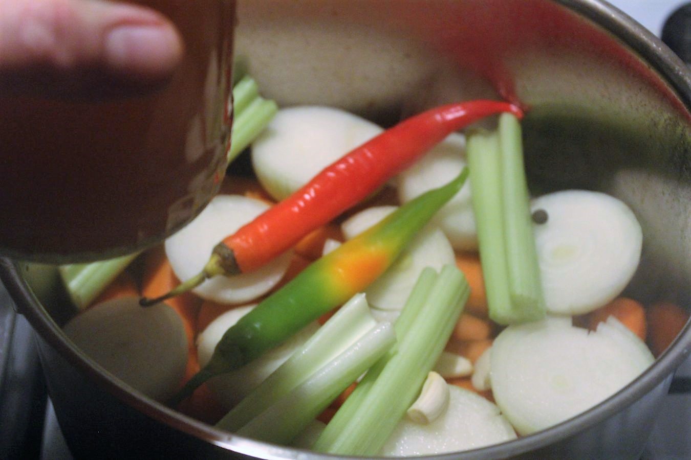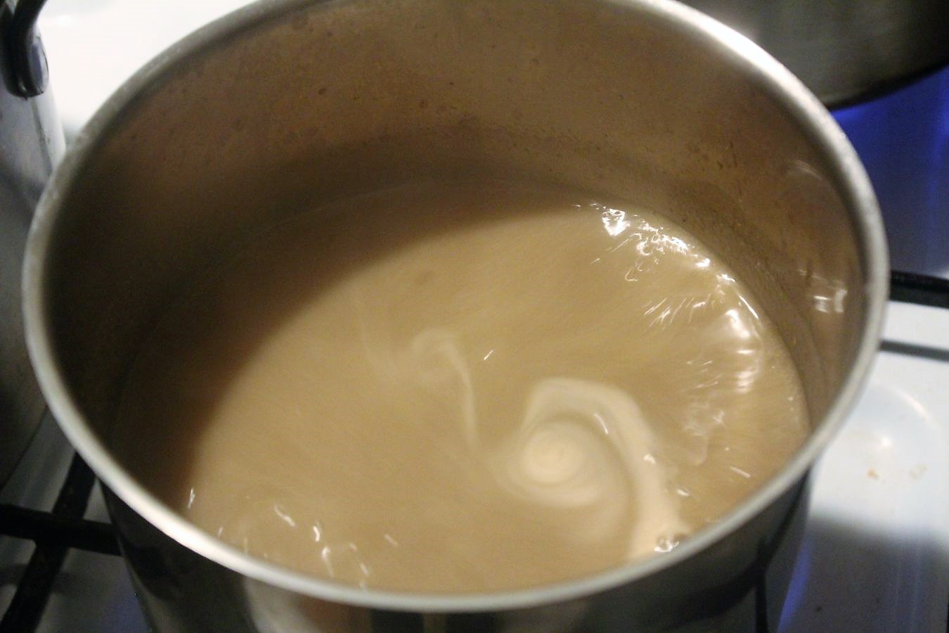 Damit wird nun das Butter-Mehlgemisch vom Topfboden abgelöscht.