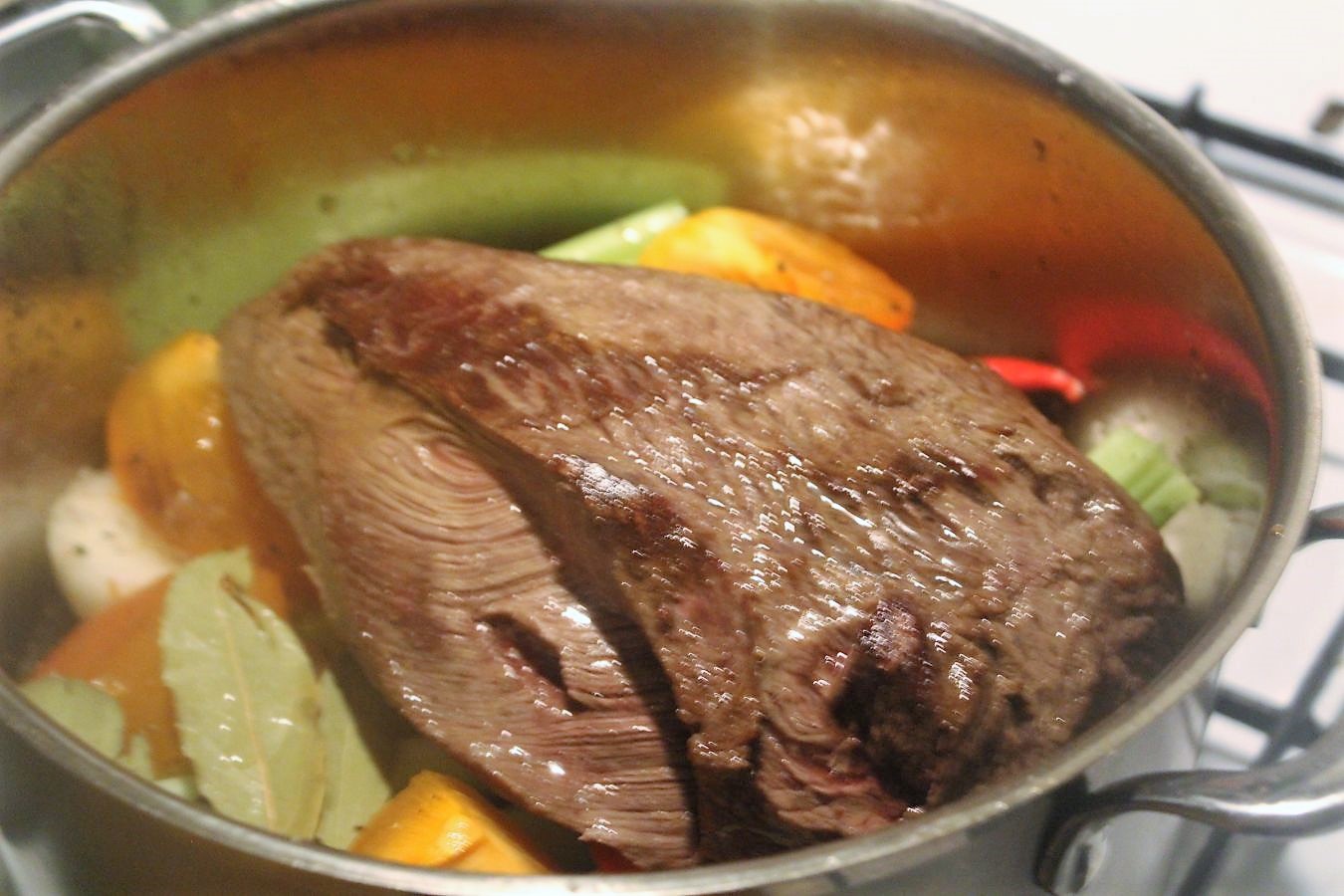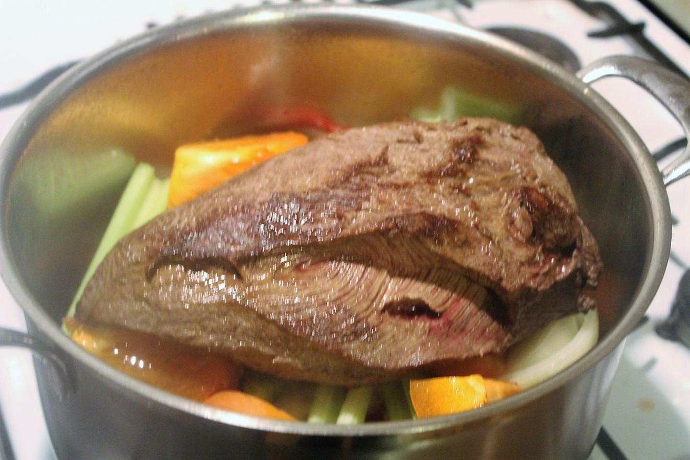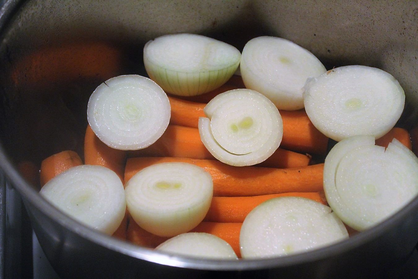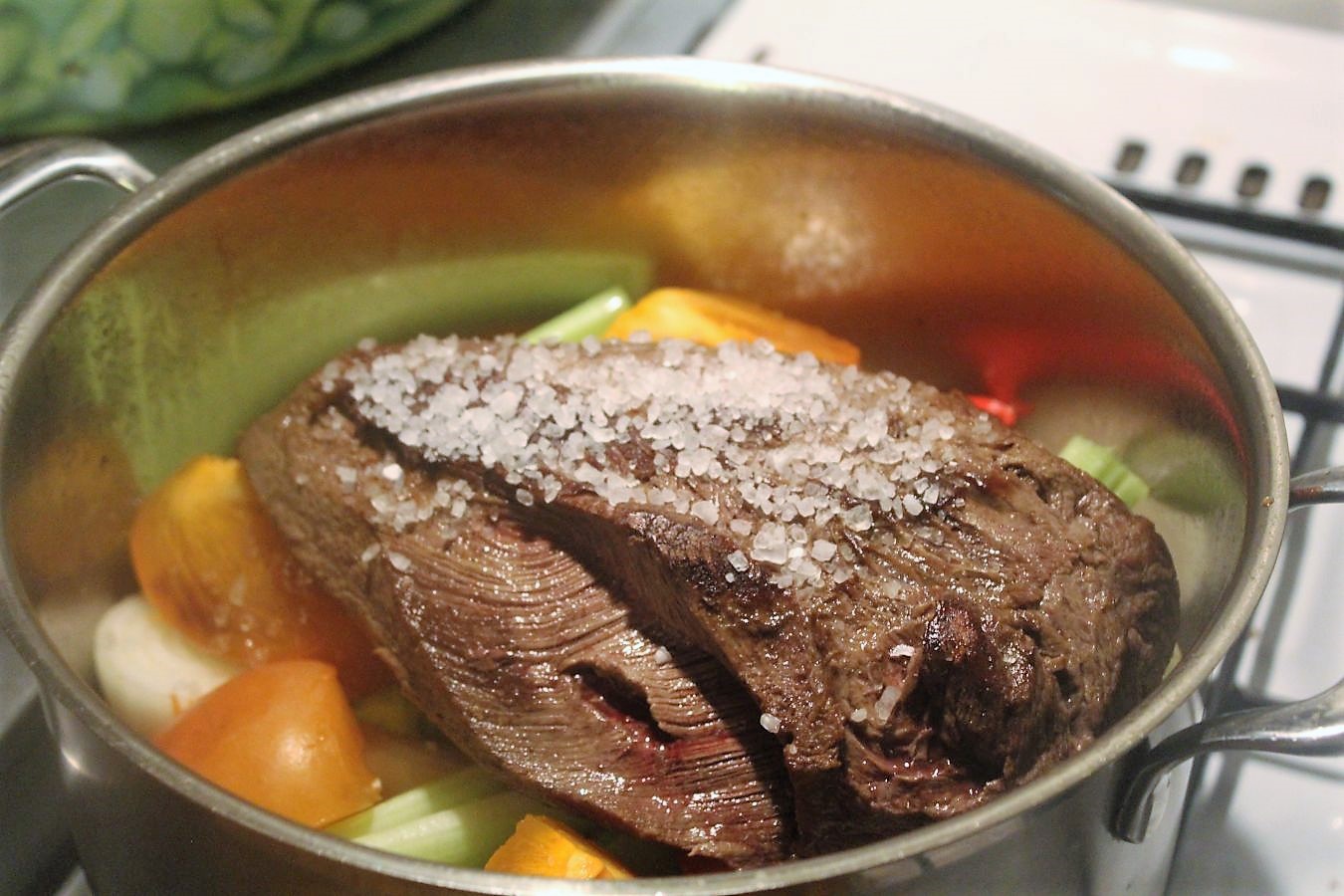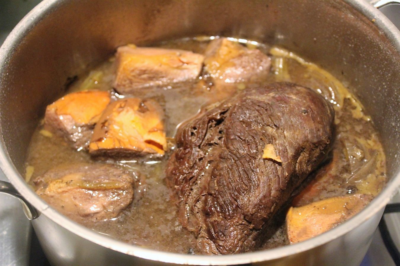 Hier kann man sehen, wie das Fleisch beim Schmoren in der Flüssigkeit einsinkt, in dem Maße wie das Gemüsebett durch das Schmoren an Volumen verliert.
