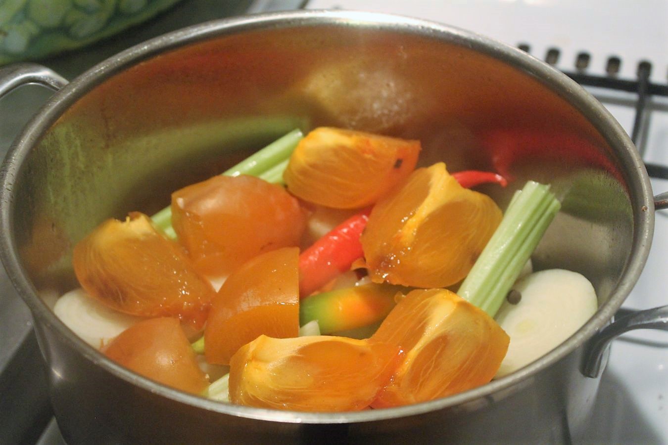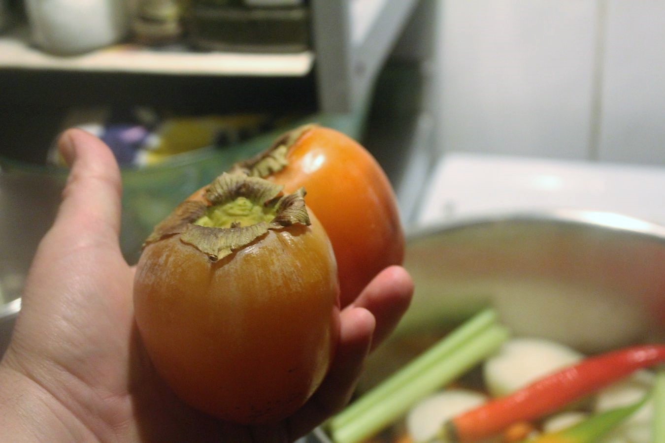 Das ist echt sensationell lecker. Das zarte Fleisch, mit einer richtig vollen Soße die aus Brühe, dem ganzen frischen Gemüse, den Khaki und dem Brandy besteht, mit Mehlschwitze gebunden.