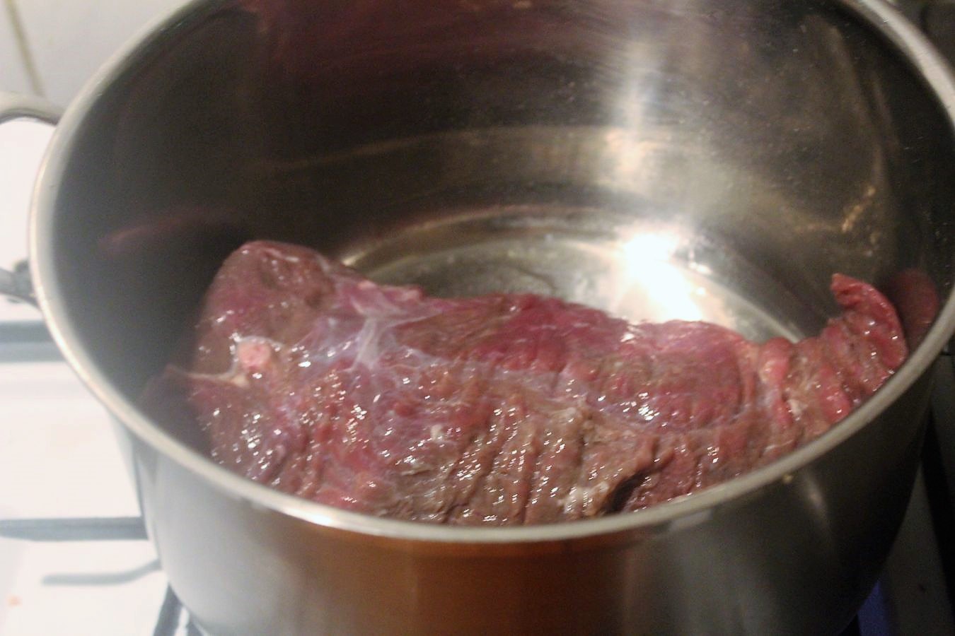 Fleisch aus dem Topf holen und gegen die Fleischfaser aufschneiden.