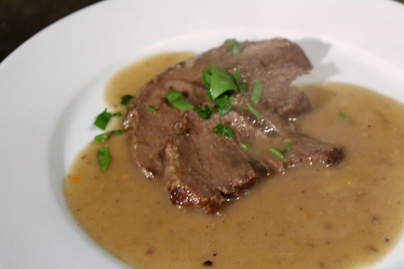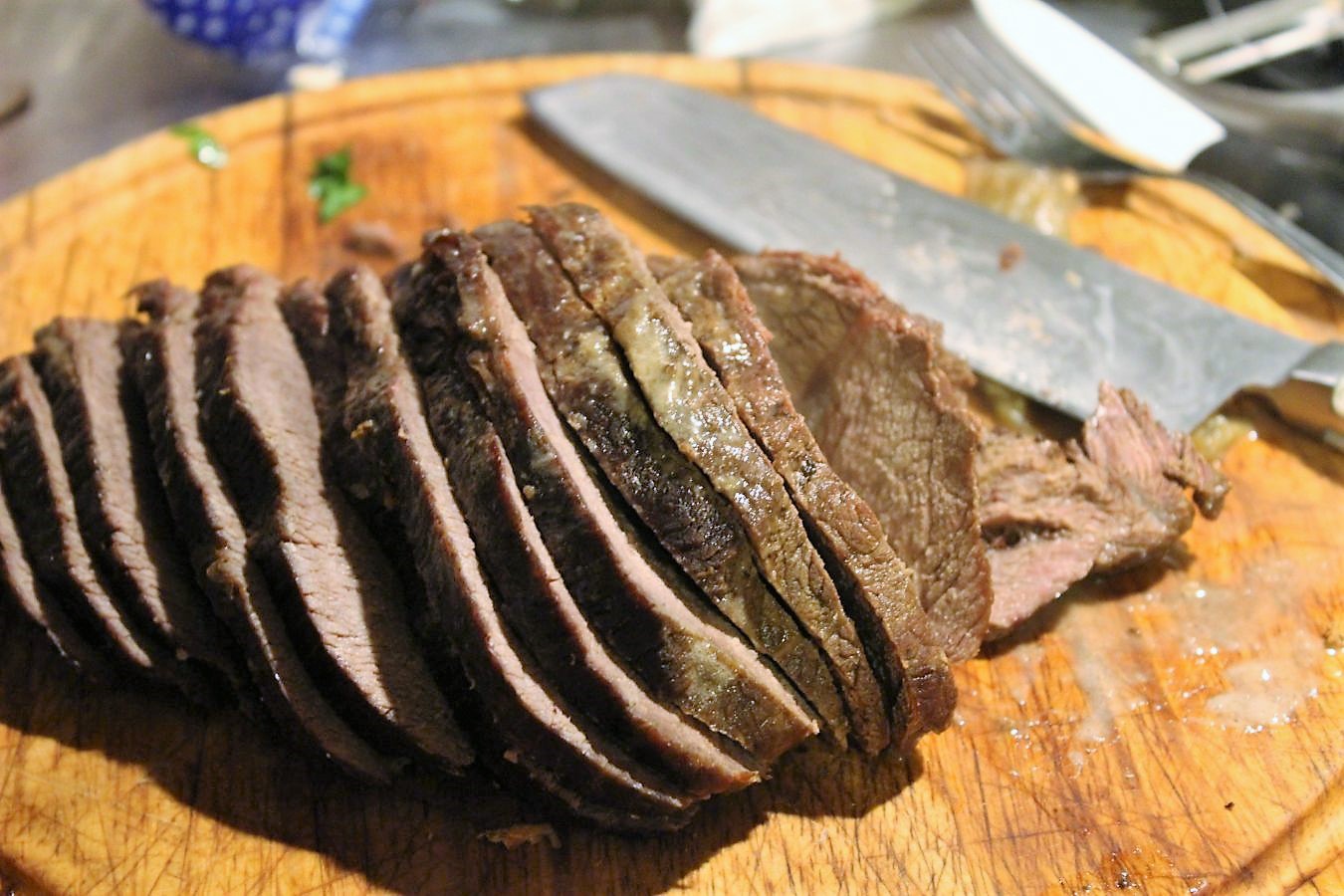 Nach drei Stunden ist der Gargrad so, dass man es auch am gleichen Tag essen könnte, oder eben am nächsten Tag wieder auf Temperatur bringt. Dann fühlt es sich bei 70 Grad Kerntemperatur an, wie frisch gekocht.