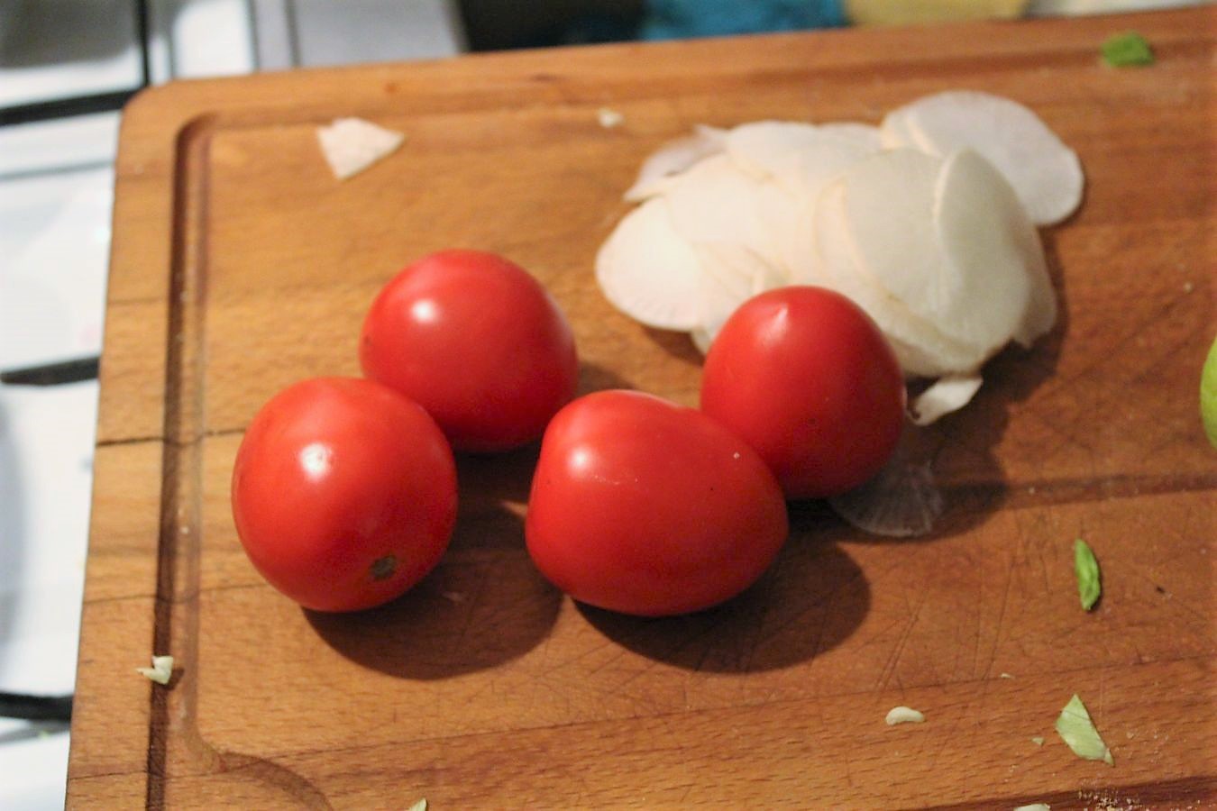 Ich habe einen Rettich in dünne Scheiben geschnitten, aber es gehen auch Mairüben, oder Radieschen.