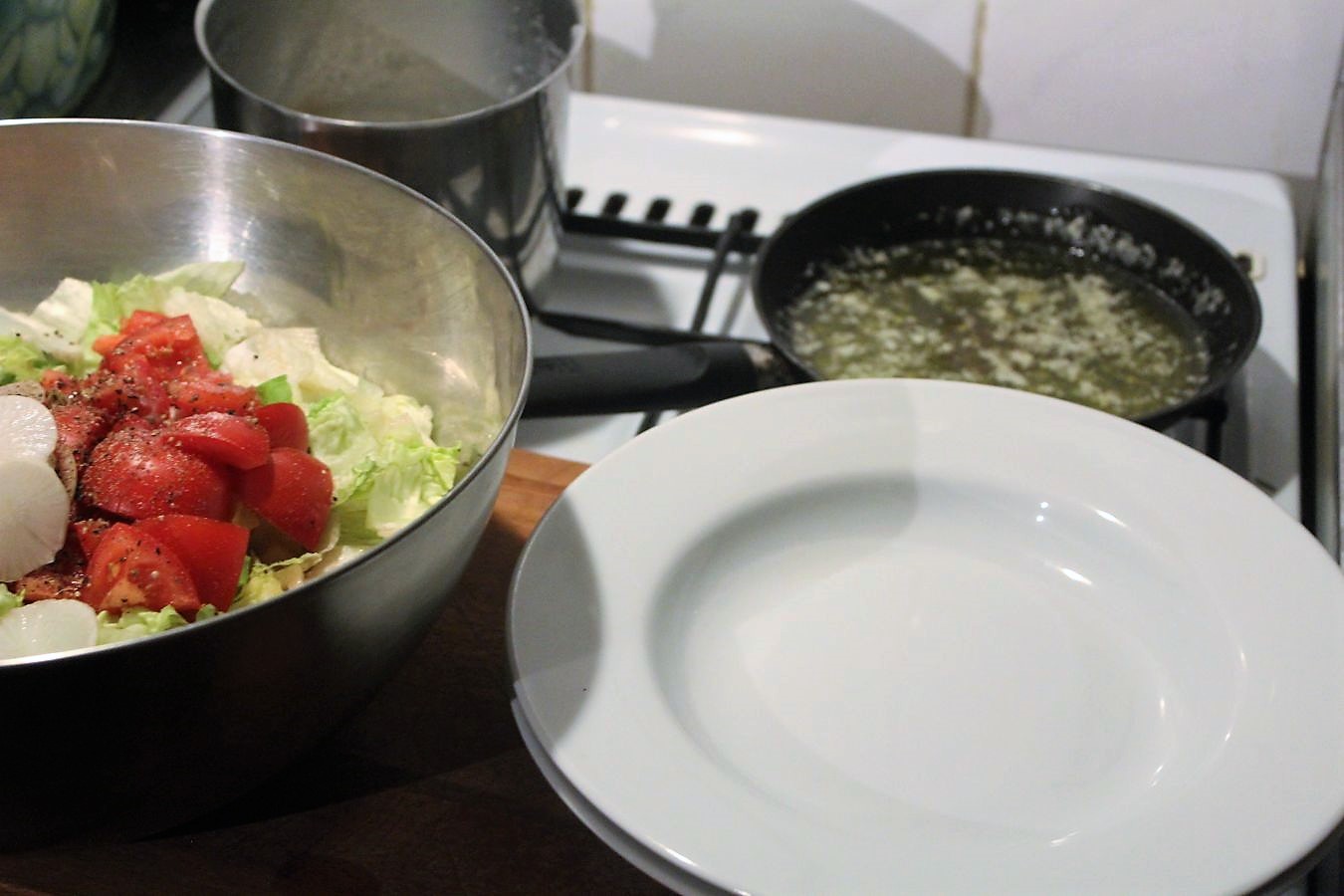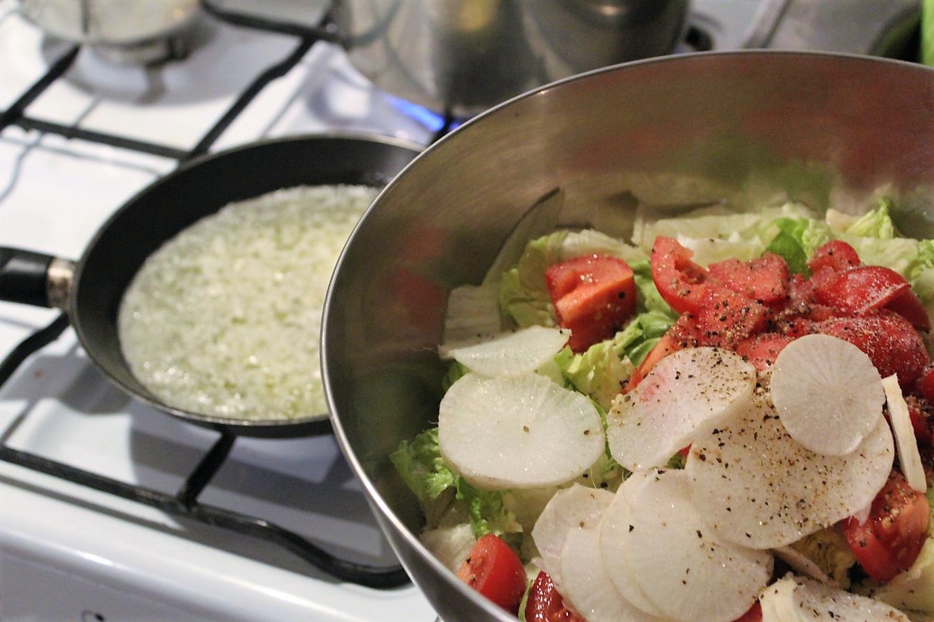 Der Salat steht schon in Sichtweite der Butter, in der kleinen Pfanne.