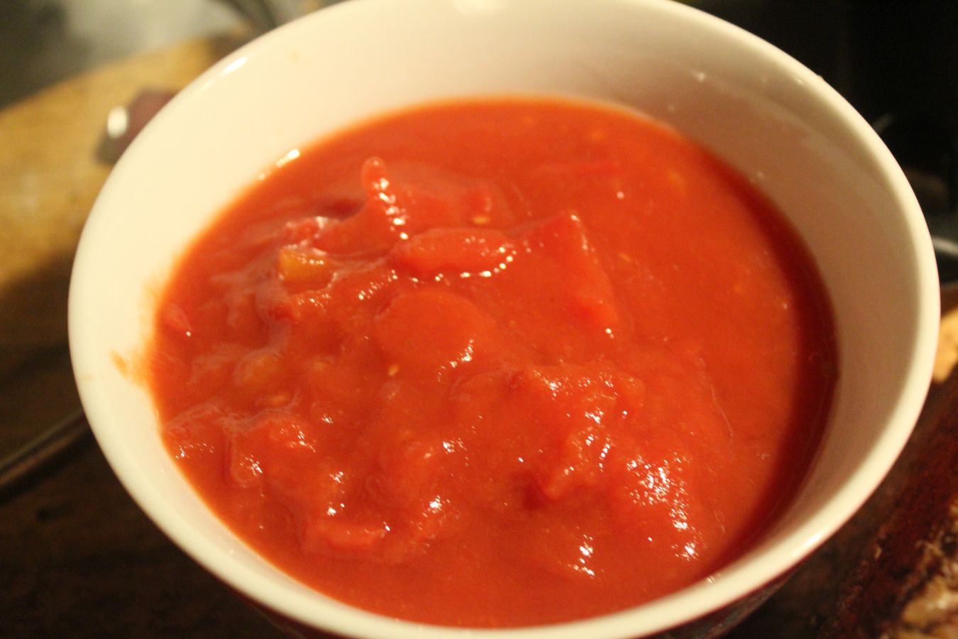 500 Gramm Pizzatomaten (die gehackten). Wenn die Dose nur 425 Gramm hat, fällt auch niemand tot um
