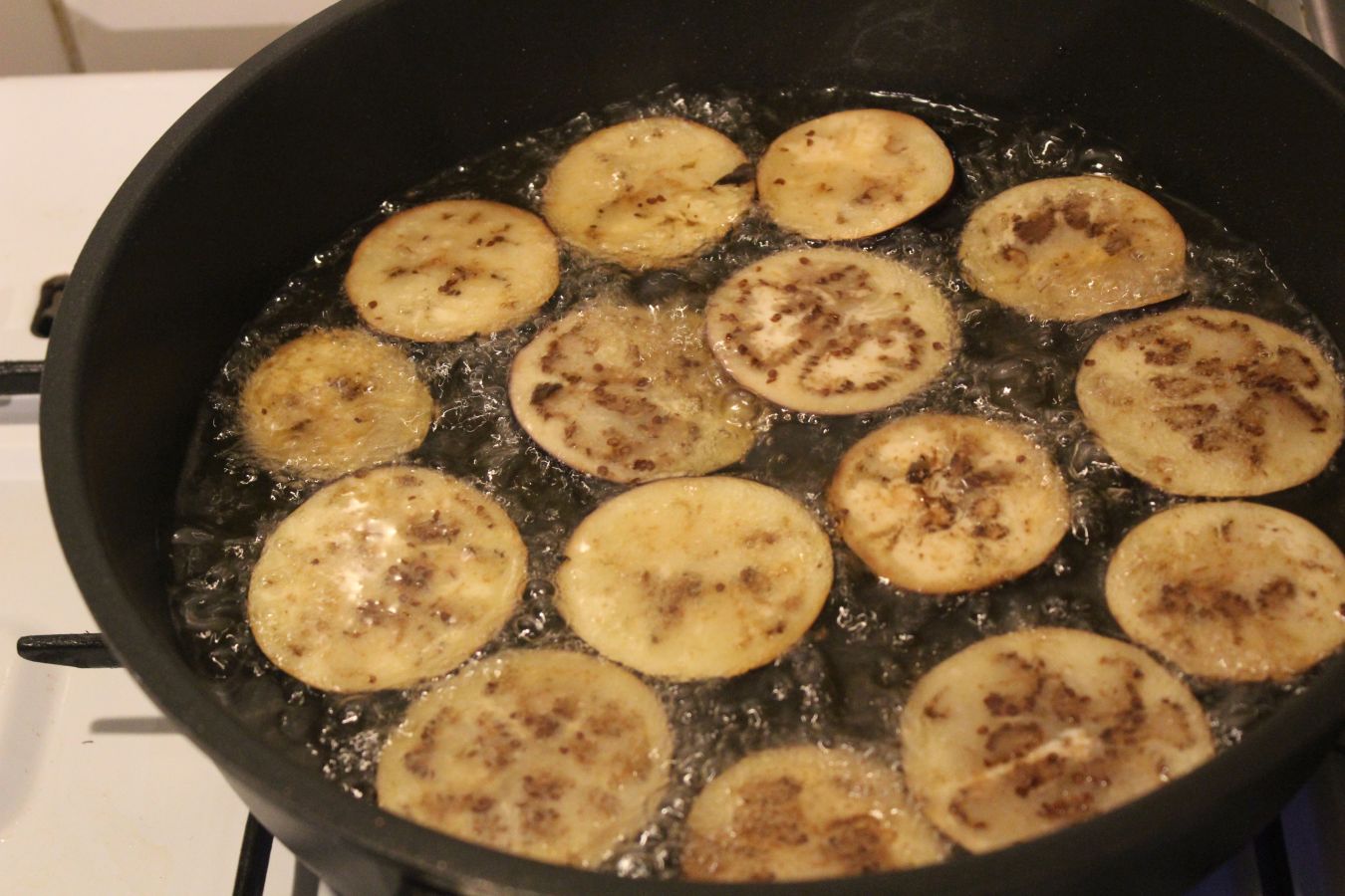 Herd läuft auf Vollgas. Auberginenscheiben von beiden Seiten schwimmend im Öl ausbacken.