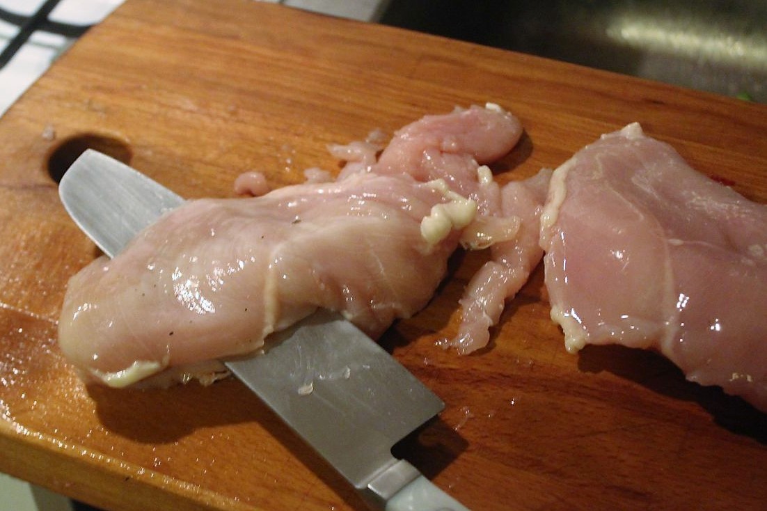 Hähnchenbrust mit einem scharfen Messer in drei dünne Scheiben aufschneiden