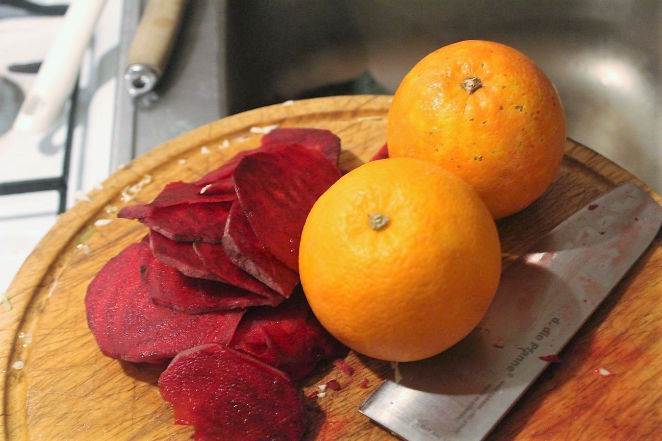 Wenn die Vorspeise serviert werden soll, die roten Bete in dünne Scheiben schneiden. Ich habe ein scharfes Messer genommen, ein Hobel geht natürlich auch