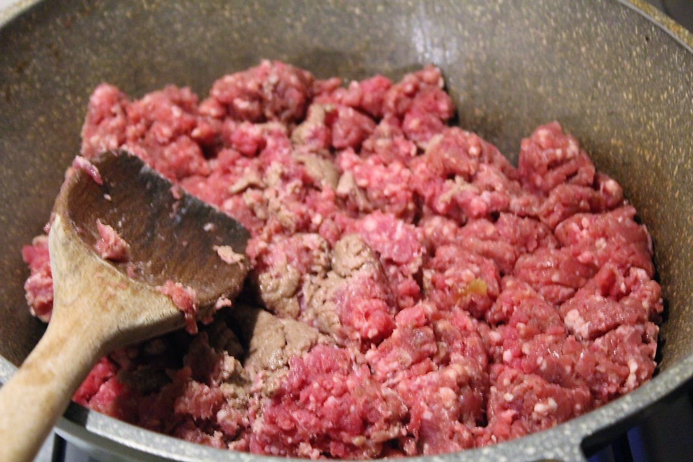 Das Fleisch brate ich ohne extra Fett in der Pfanne und röste das vorhandene Fett richtig raus. Pfanne erst volle Pulle beheizen, nach 10 Minuten auf halbe Kraft runter gehen. Danach auf kleiner Kraft weiter rösten, bis das Hackfleisch angenehm braun ist. Da stelle ich mir dann die Eieruhr immer wieder auf 5 Minuten ein und rühre regelmäßig den Pfanneninhalt durch, damit nichts anbrennen kann.