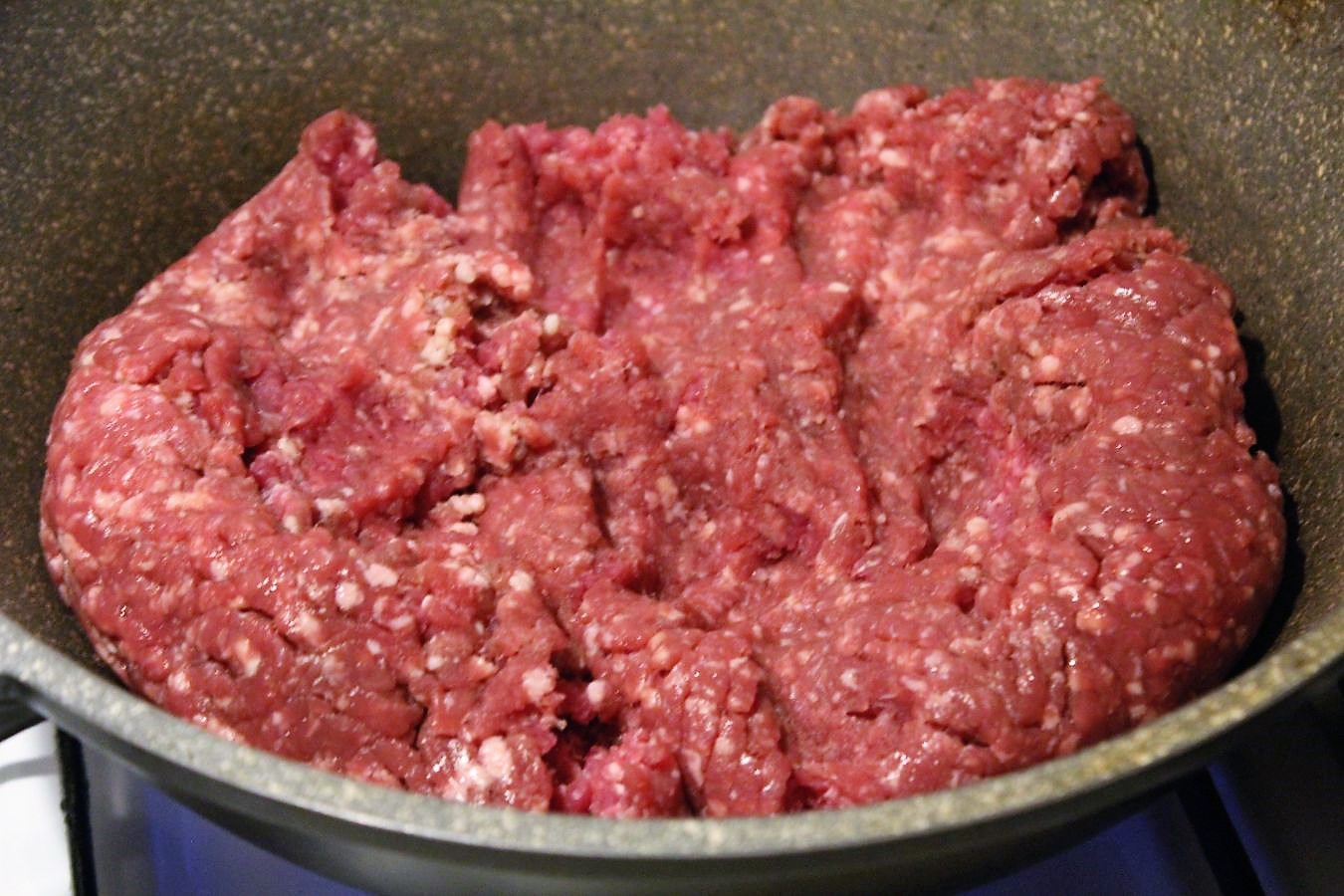 Am nächsten Abend geht es weiter und dann brauche ich gar nicht mehr lange, vielleicht noch eine knappe dreiviertel Stunde. Öl in den Topf geben, das Hackfleisch rein und auf mittlerer Hitze heiß werden lassen.