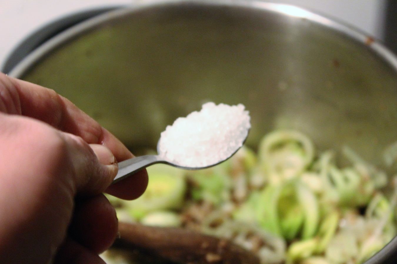 Einen Teelöffel Meersalz nehmen. Das ist nicht viel, aber nachwürzen können wir immer noch und wenn die Suppe eine Nacht steht und wieder erwärmt wird, ist sie meistens auch noch salziger als am ersten Tag.