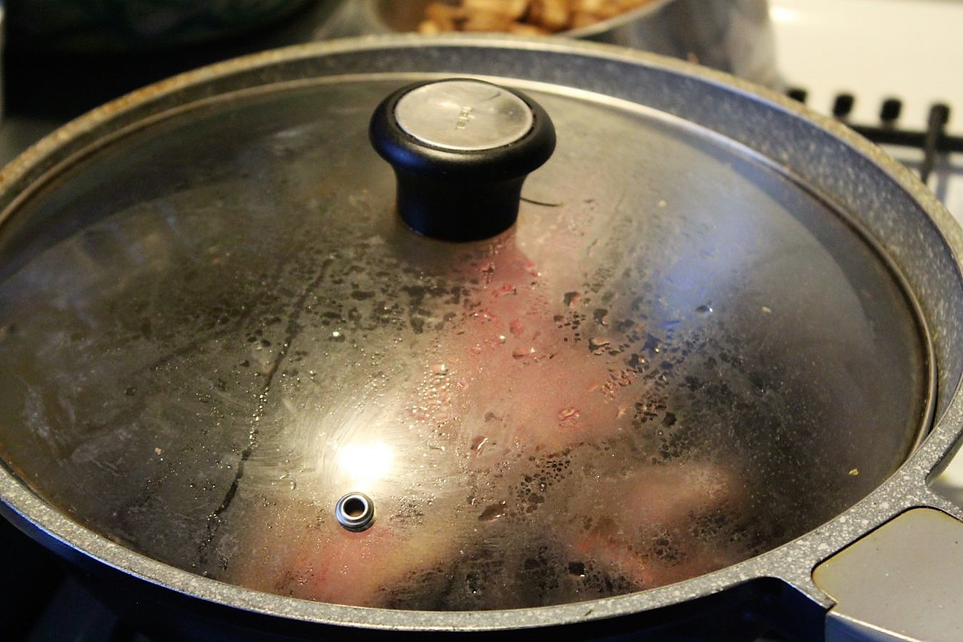 Deckel auf den Topf, oder Wok legen und dann auf niedrige Temperatur reduzieren. Nicht ungeduldig sein. Das kann auch schon mal 30 Minuten dauern, je nach Fettmenge. Das hier sind eher 20 Minuten. Das schmeckt aber auch 20 Minuten besser, als wenn man Öl nimmt.