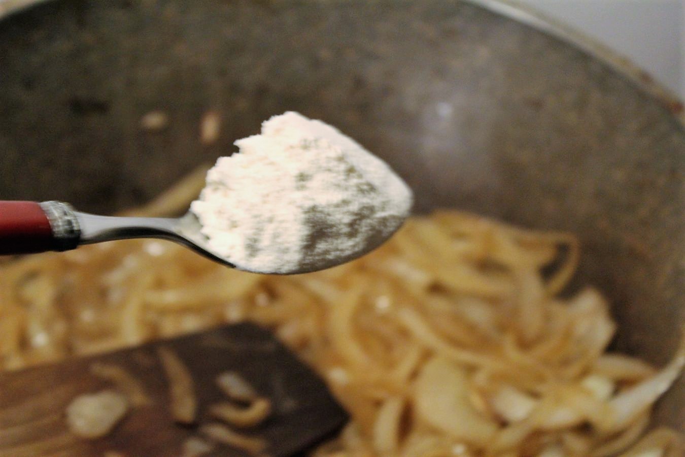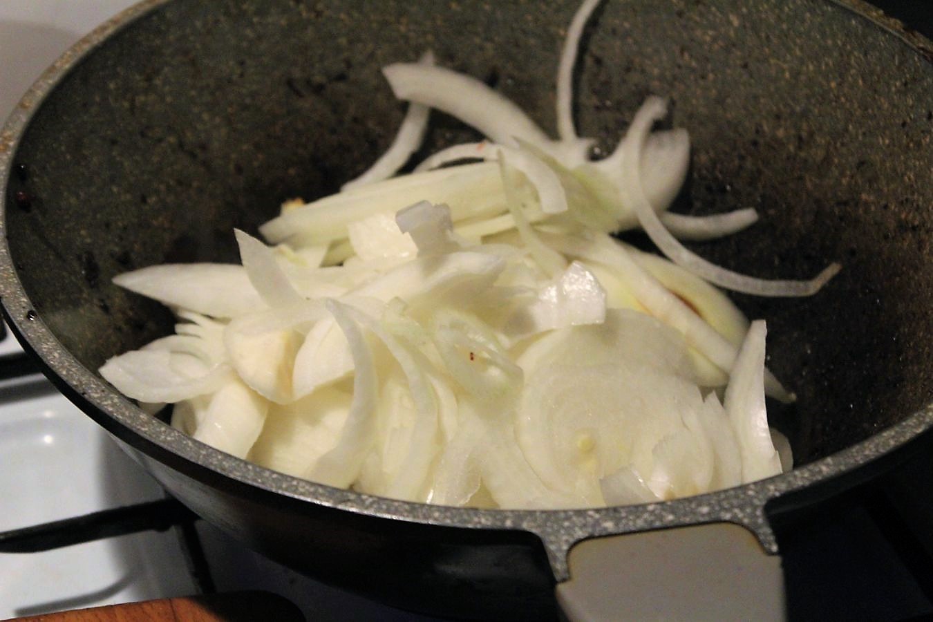 6 Esslöffel Öl in die Pfanne, oder Butter und dann die Zwiebeln anbraten und regelmäßig wenden.