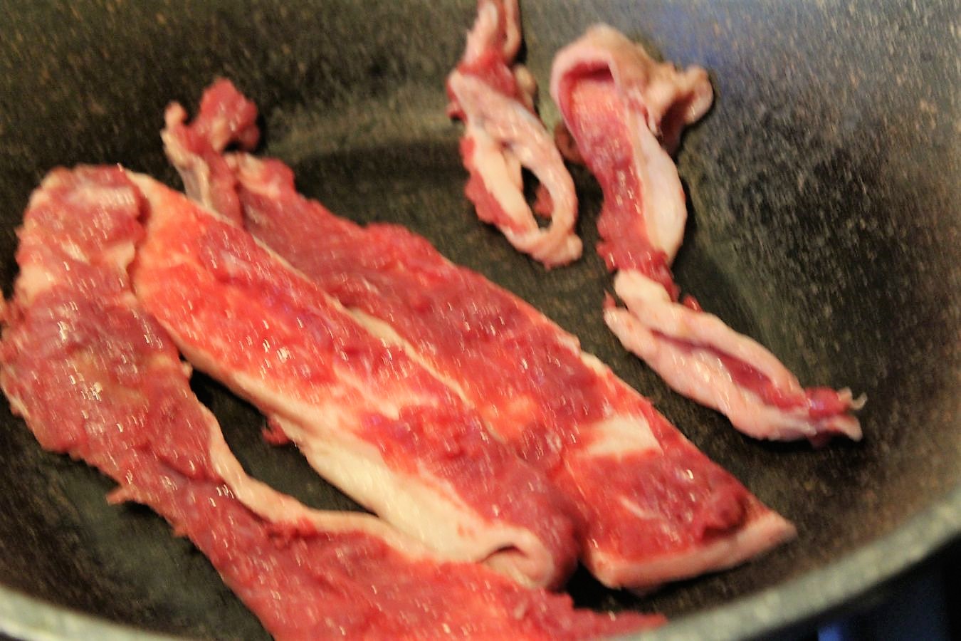 Hier könnt Ihr schon sehen, wie das Fett aus dem Fleisch in die Pfanne geht. Das ist Schmalz. Da sitzt deutlich mehr Geschmack drin, als in Pflanzenöl und das hält auch höhere Temperaturen gut aus.