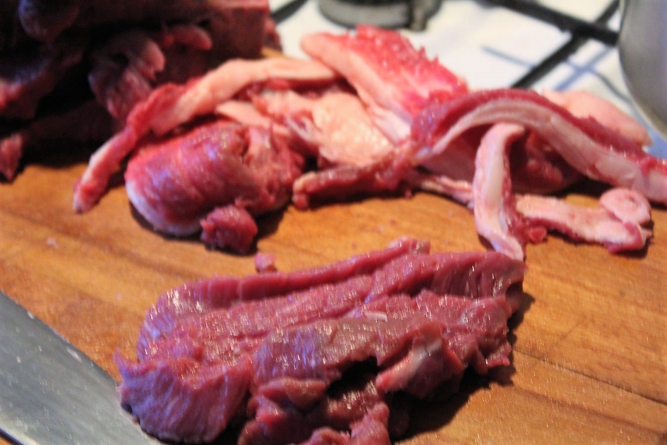 Die Fleischscheiben in Streifen schneiden und anschließend in Würfel zerkleinern.
